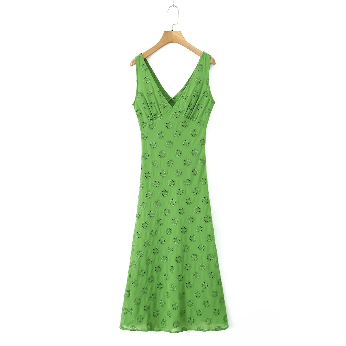 Retro Deep V Neck Sleeveless Embroidered Tea Dress
