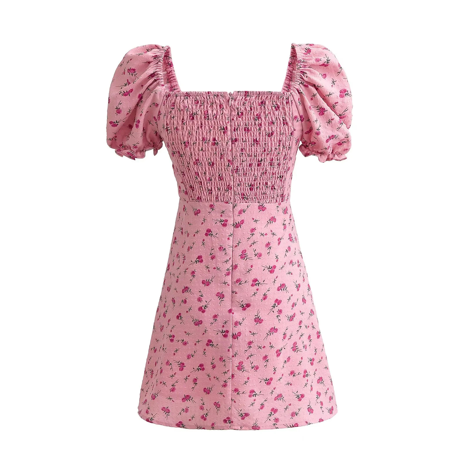 Puff Sleeve Tie-Tie Pleated Square Neck Tea Dress