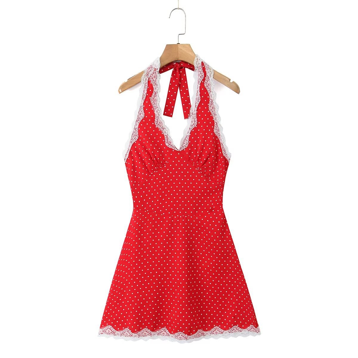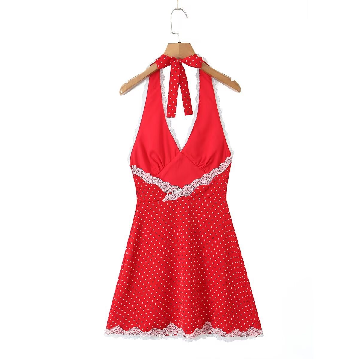 Retro style lace V-neck slim-fit halter neck polka dot dress