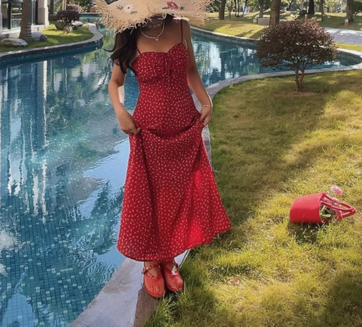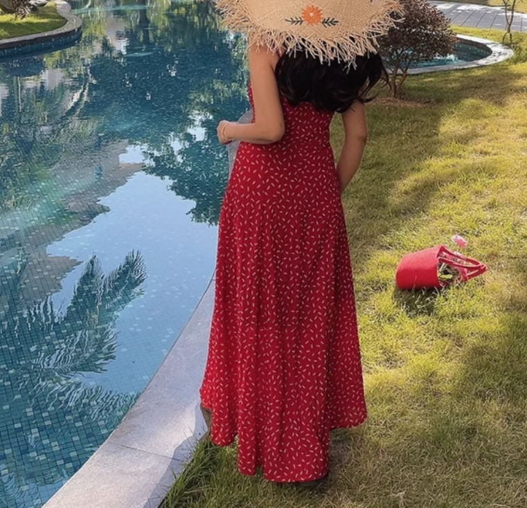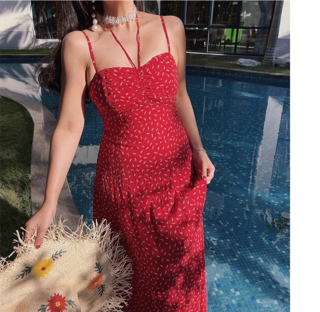 Vacation leisure waist slimming floral temperament suspender dress