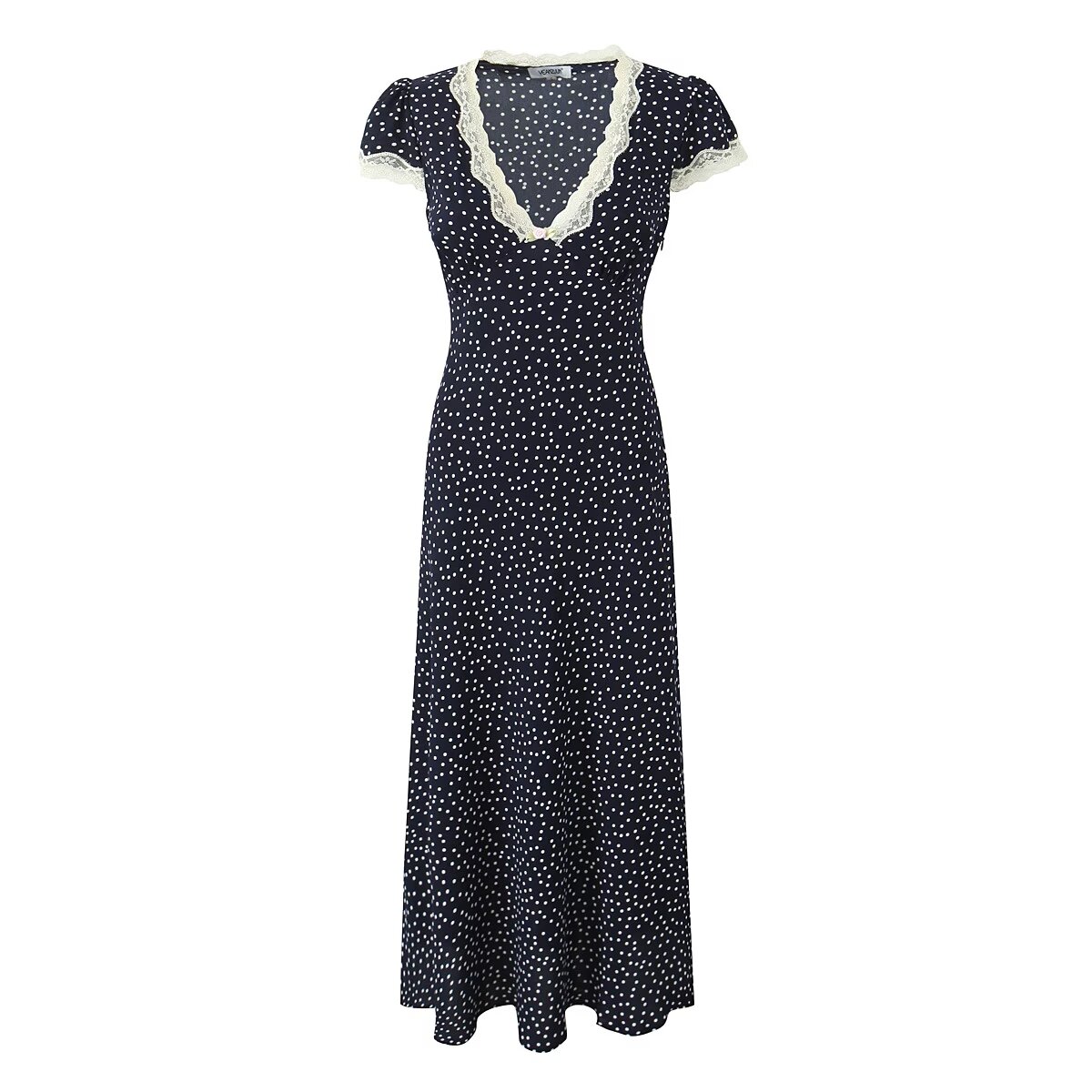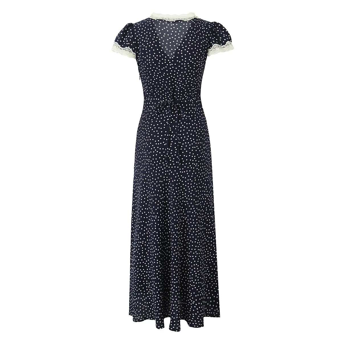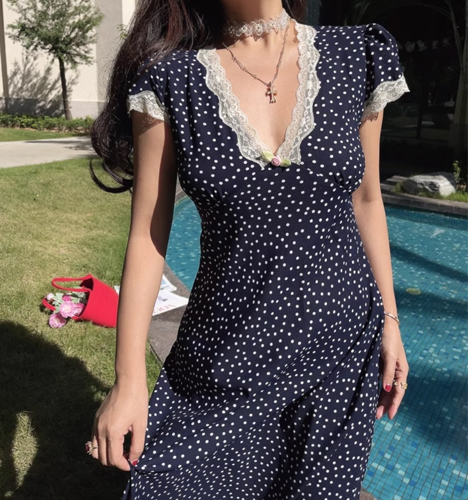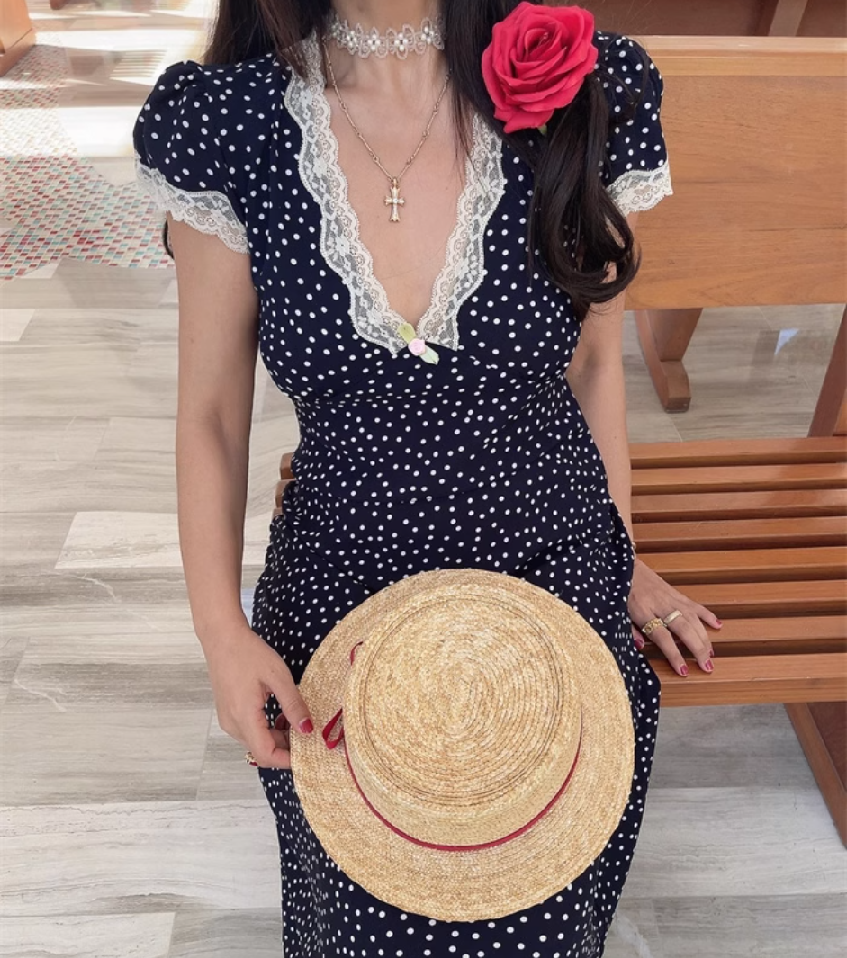 Lace Polka Dot Dress Lace Stitching Retro V-neck Midi Dress