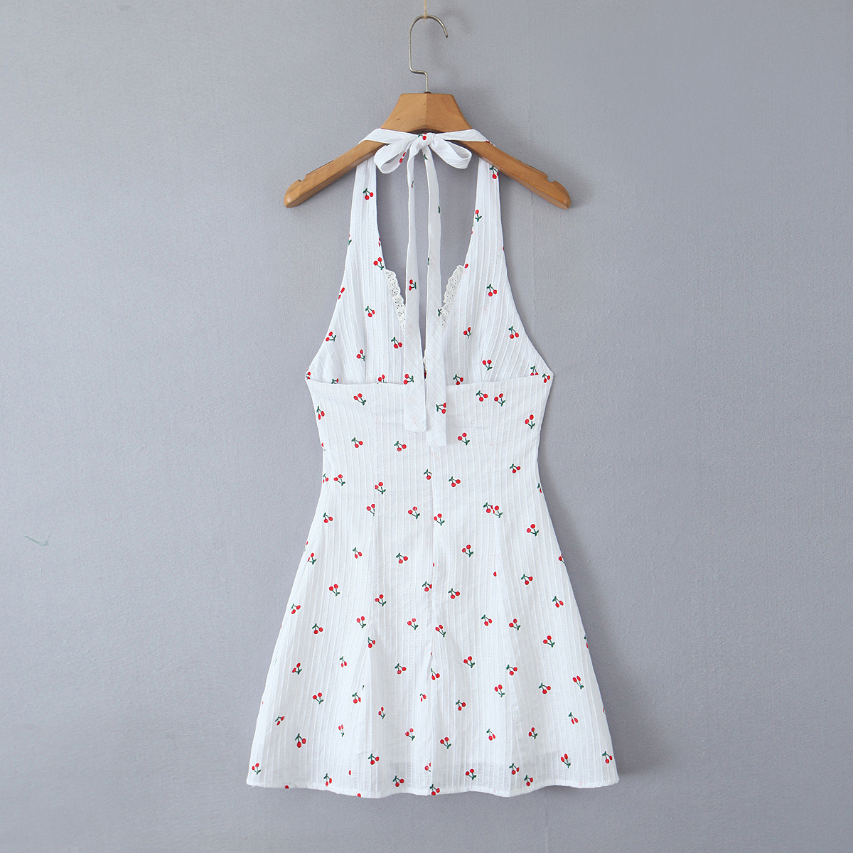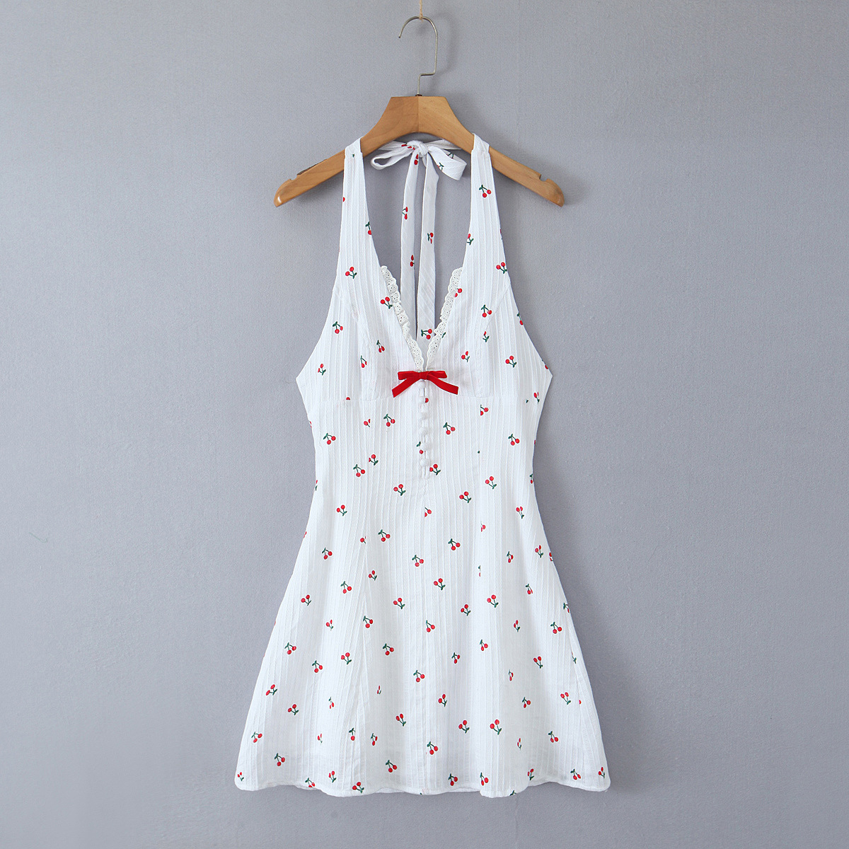 Pastoral seaside holiday style cherry waist tie halter neck dress