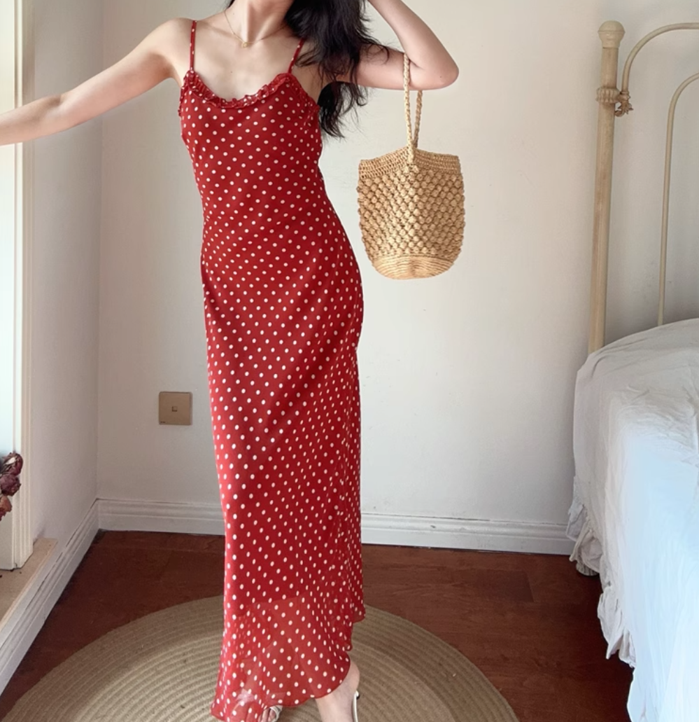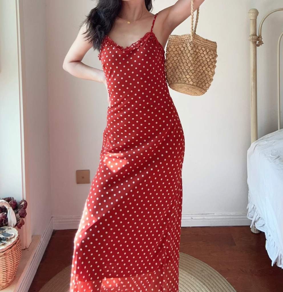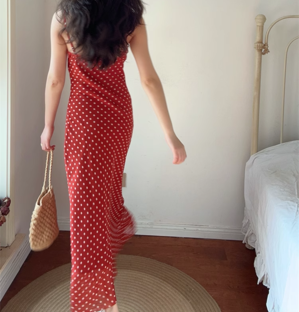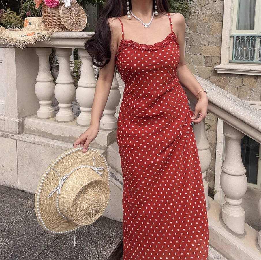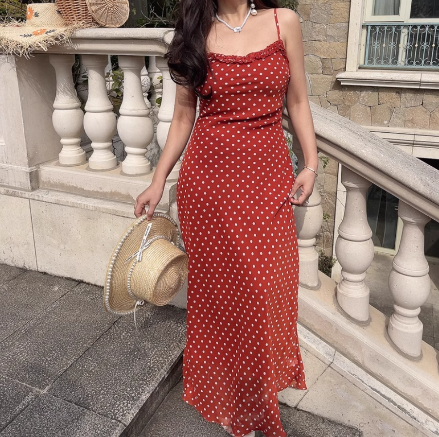 Summer beach holiday style lace collar red bottom polka dot print dress