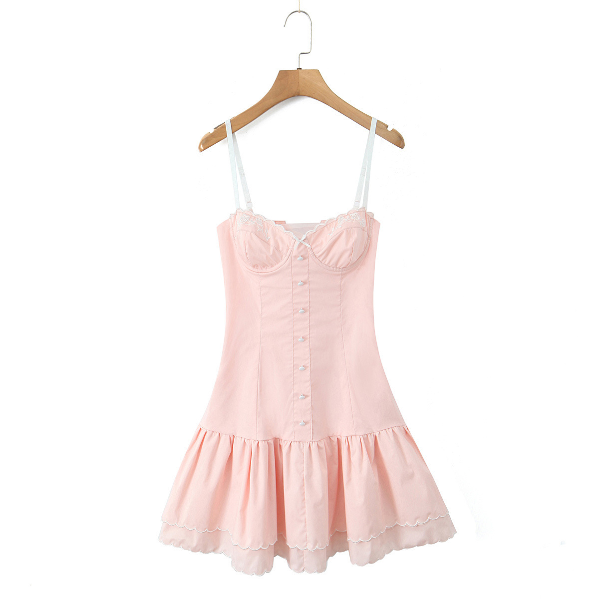 Single-breasted flower embroidered suspender skirt dress with bow on the chest