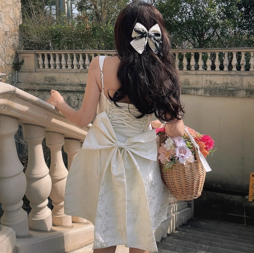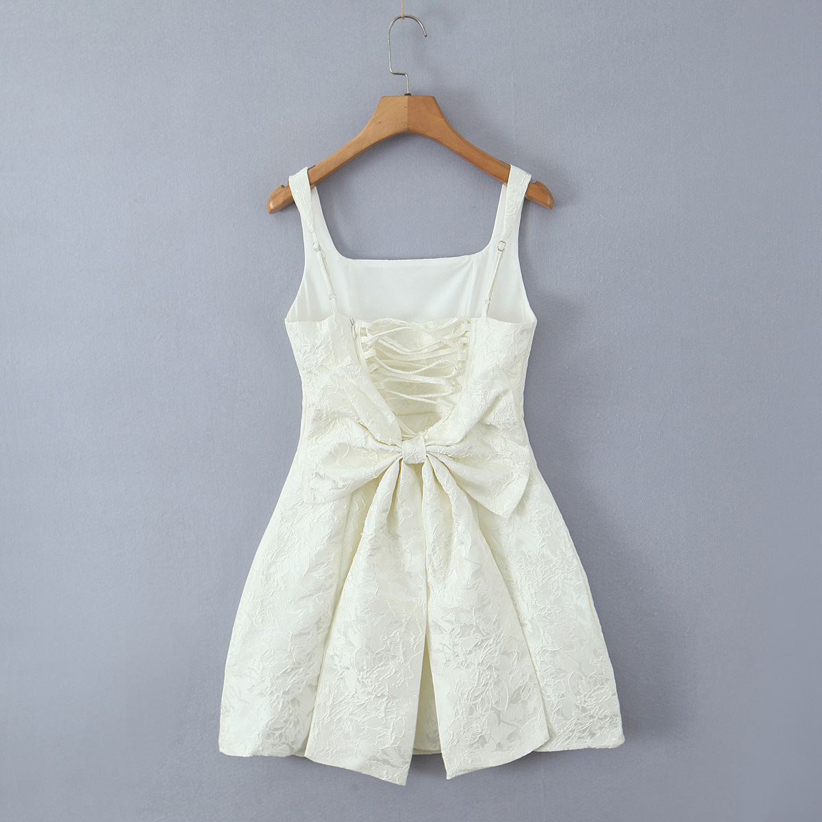 Square Neck Jacquard Back Tie Slim Fit Big Bow Waist Dress