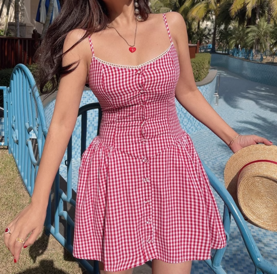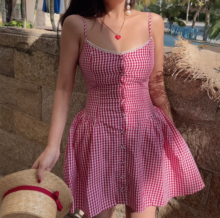 Retro style girl sweet casual plaid button closure suspender dress
