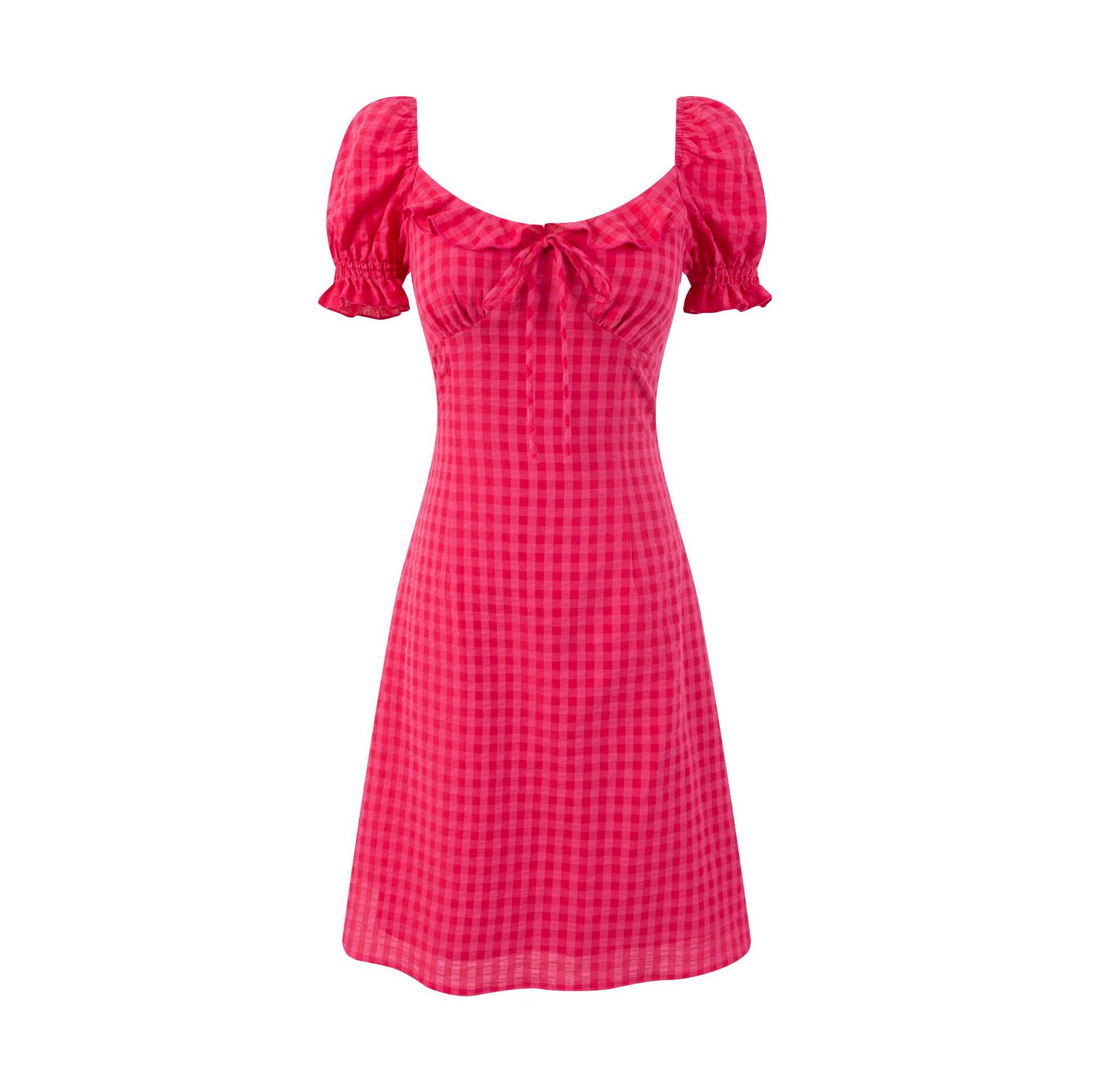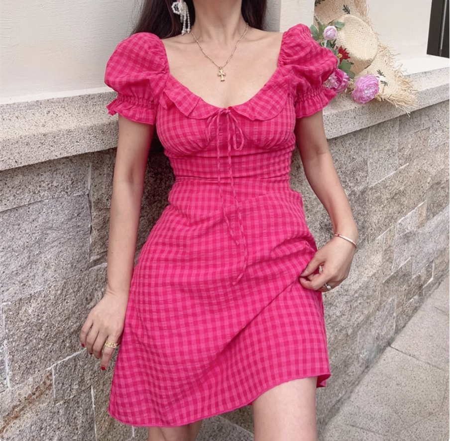 Rose Red Square Neck High Waist Slim Fit Plaid Girl Sweet and Spicy Dress
