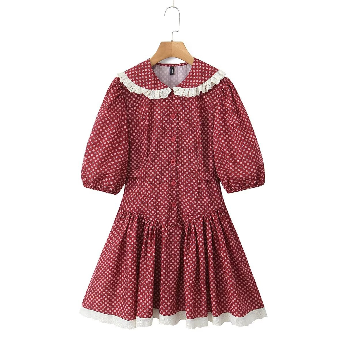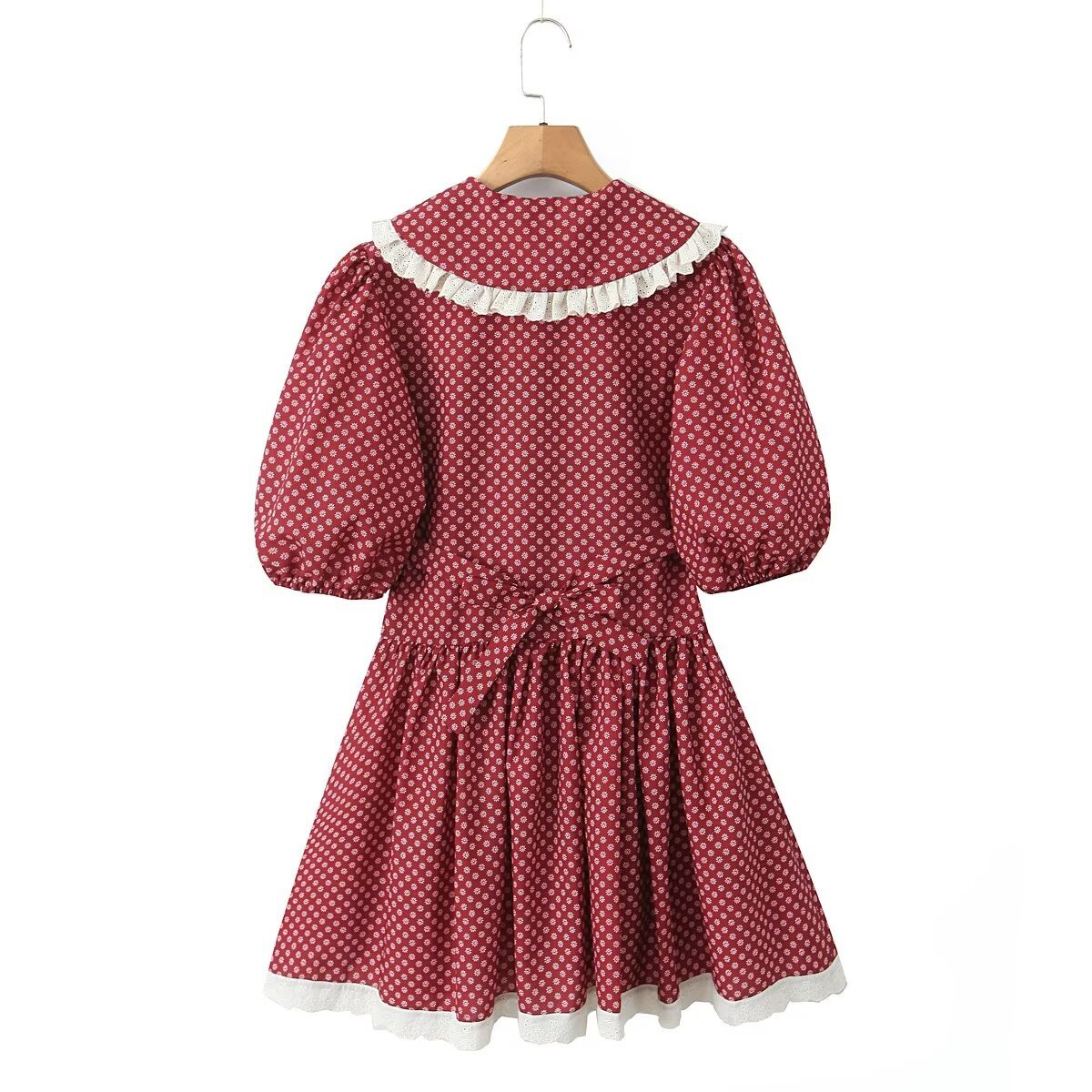Retro polka dot sweet lace edge lapel small floral waist dress