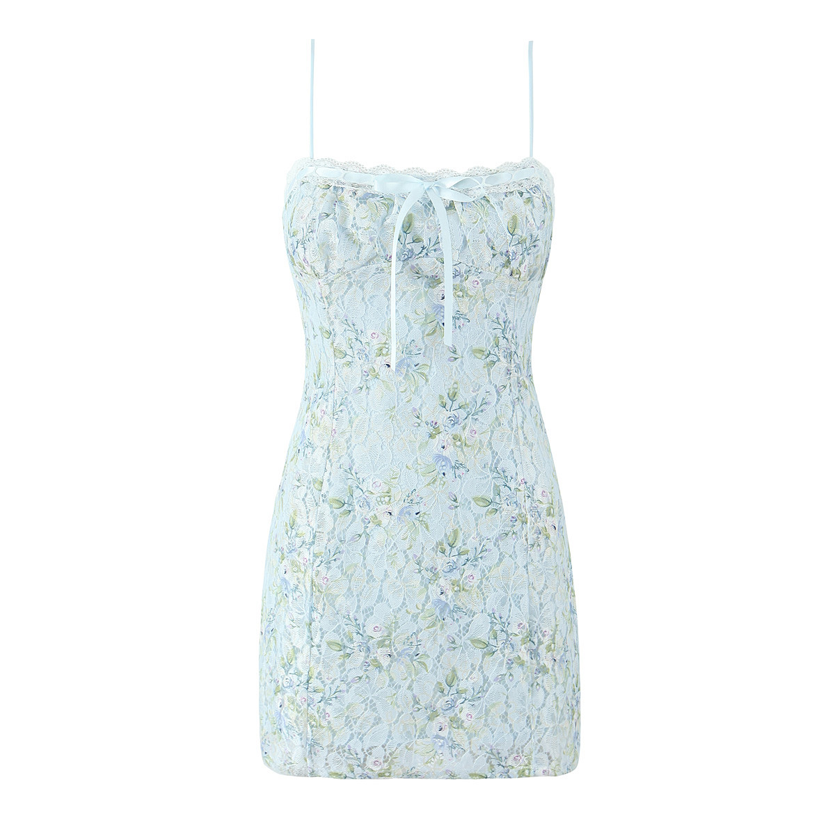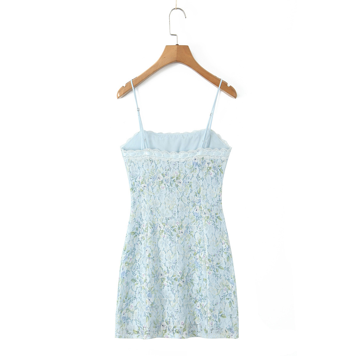 Retro blue and white porcelain floral lace patchwork V-neck waist short-sleeved dress