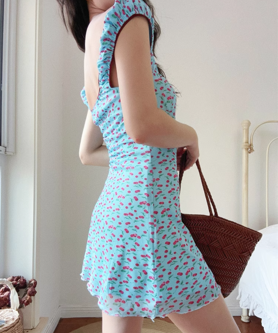 Sweet style holiday casual square neck strap sleeveless A-line dress