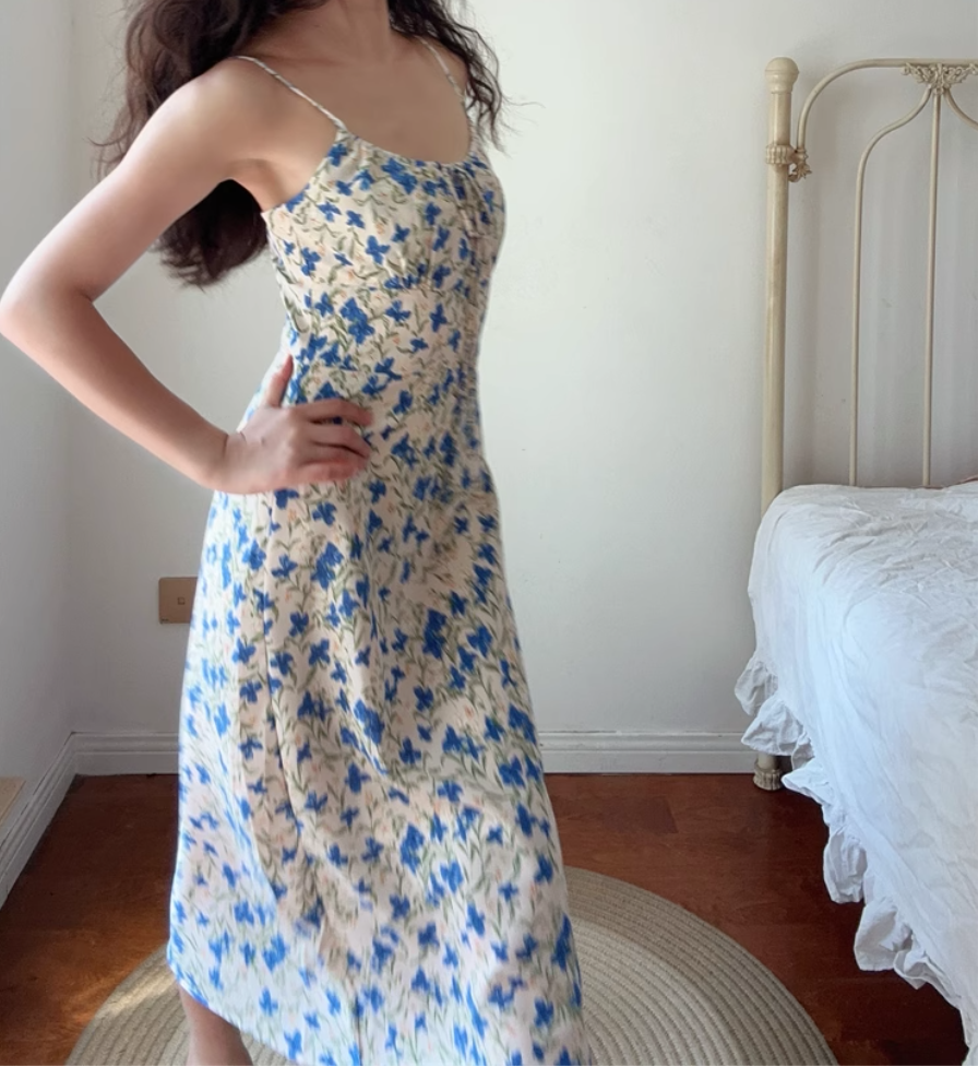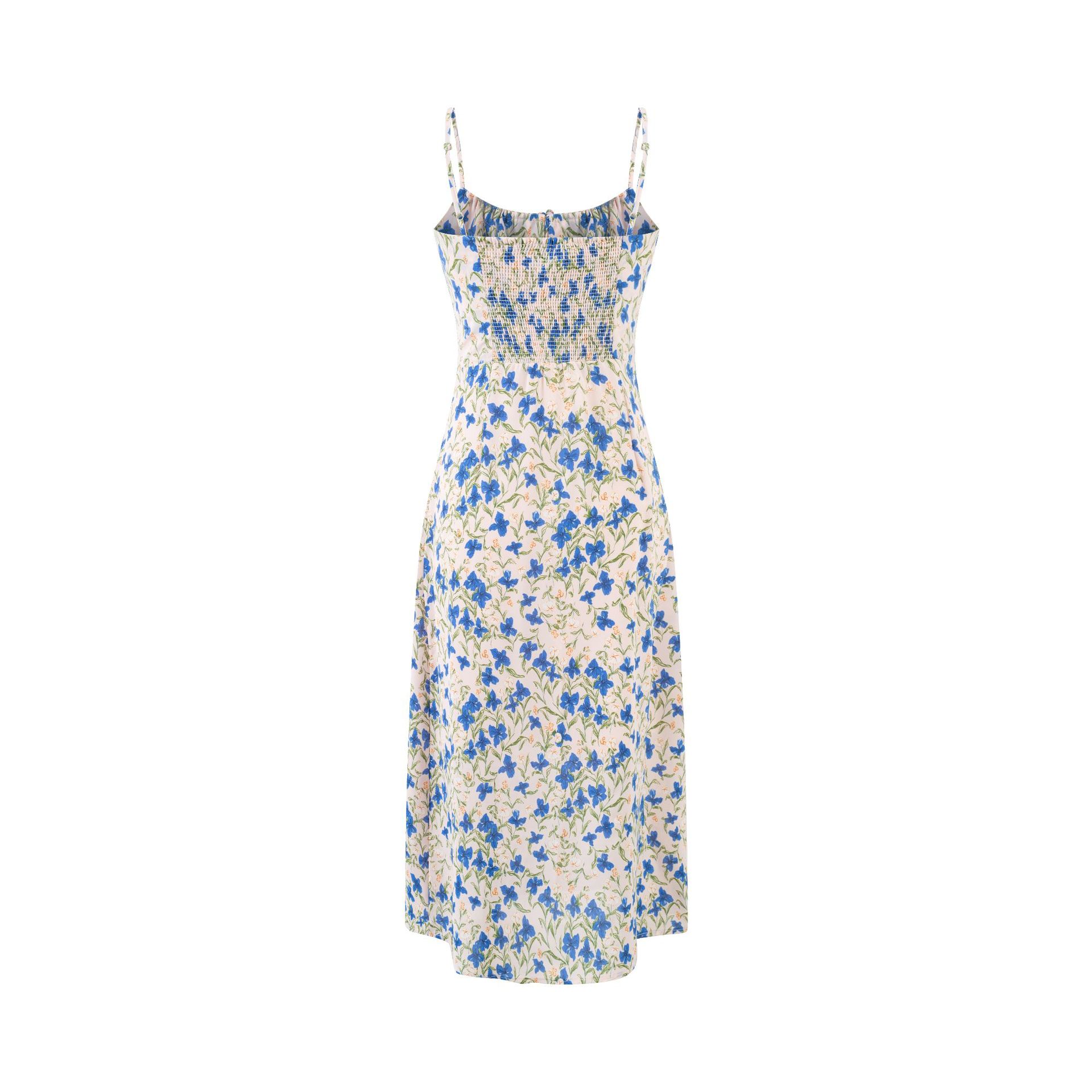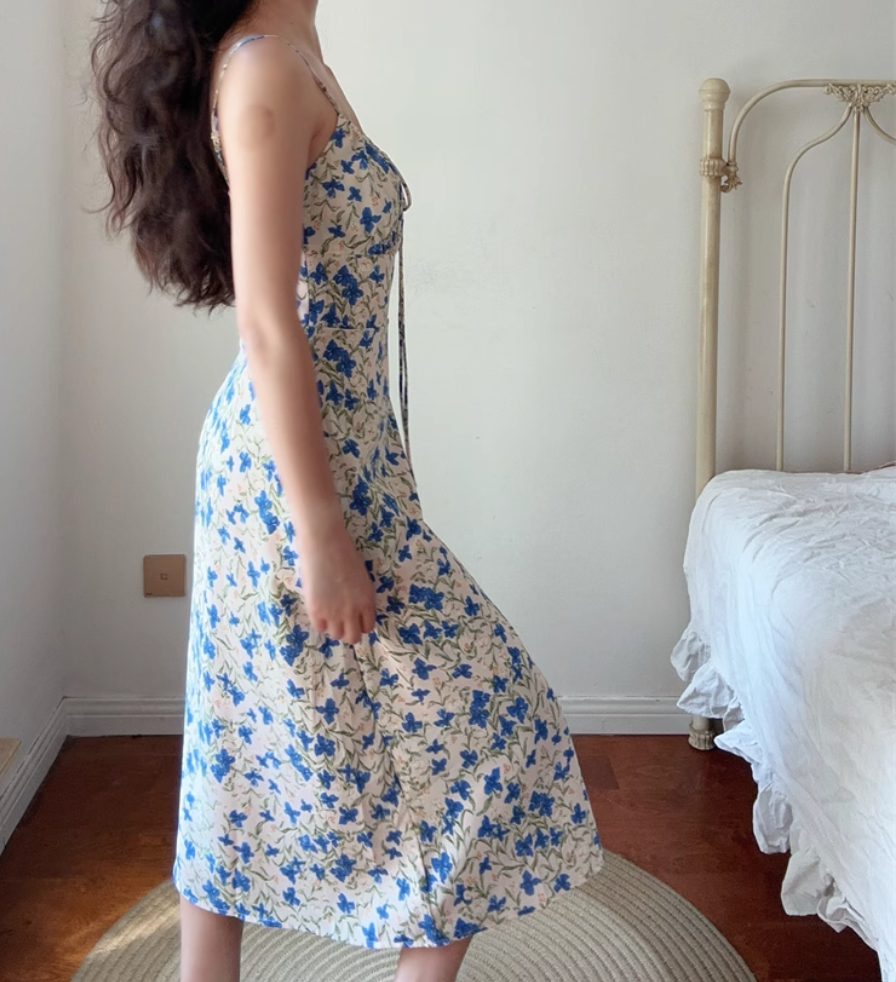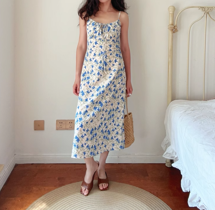 Pastoral floral drawstring waist slit vacation style suspender dress
