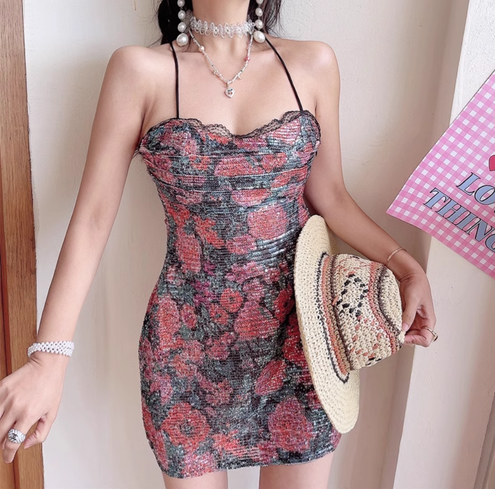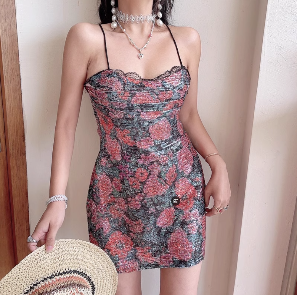 Rose Sequin Hot Girl Sexy Suspender Hip Skirt Short Skirt Dress