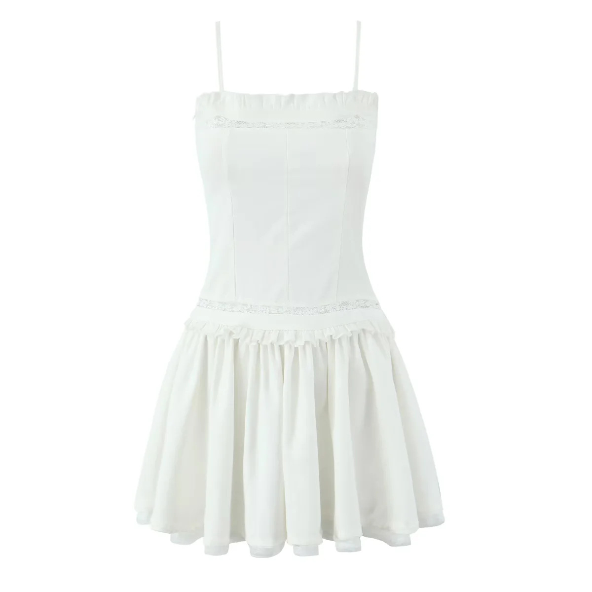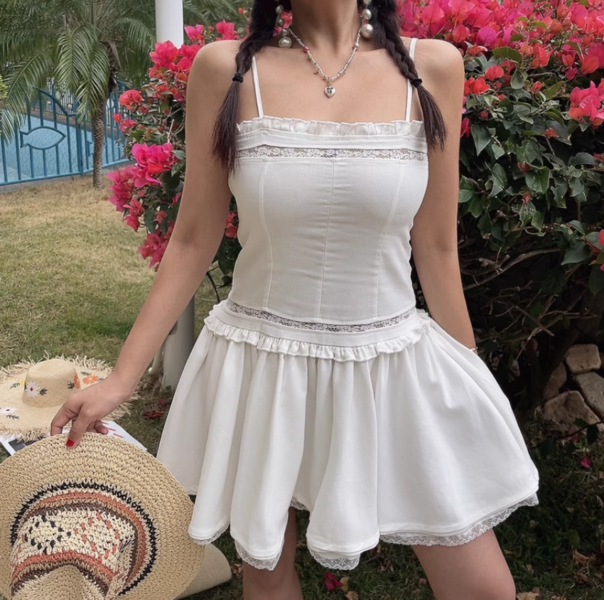 Lace trim slim suspender dress square neck waist A-line short skirt