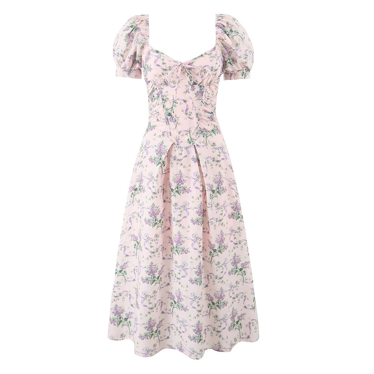 Pastoral style halterneck backless V-neck floral dress high waist holiday style maxi dress