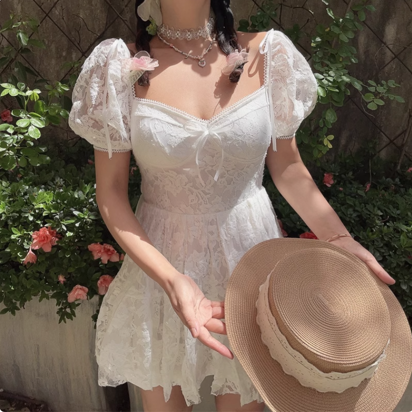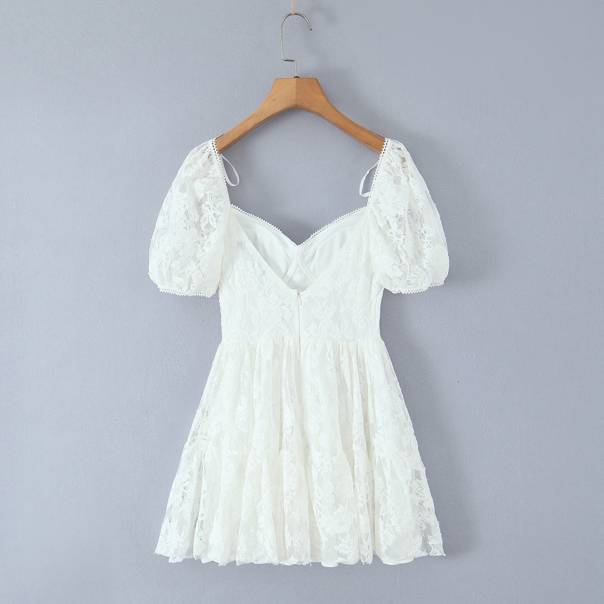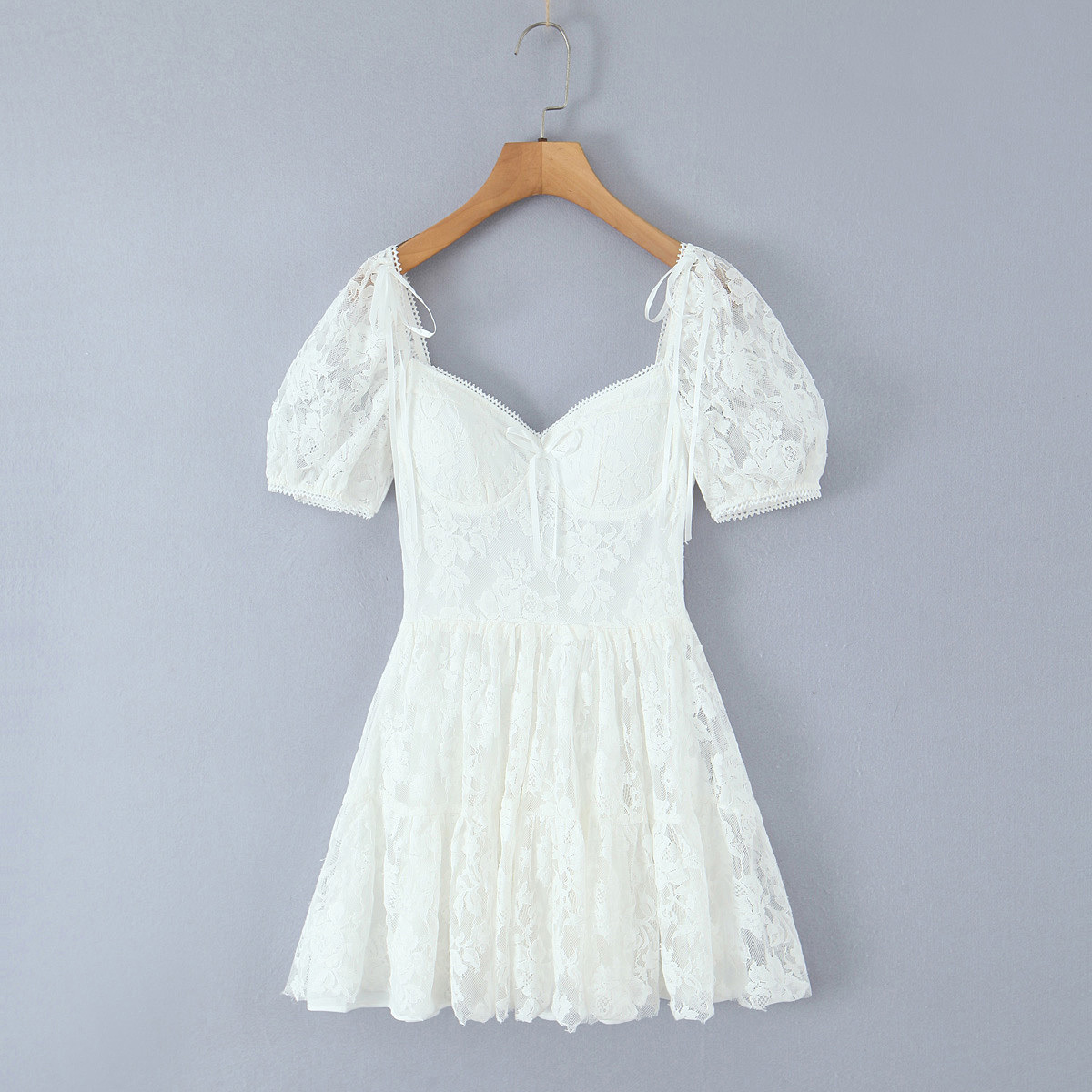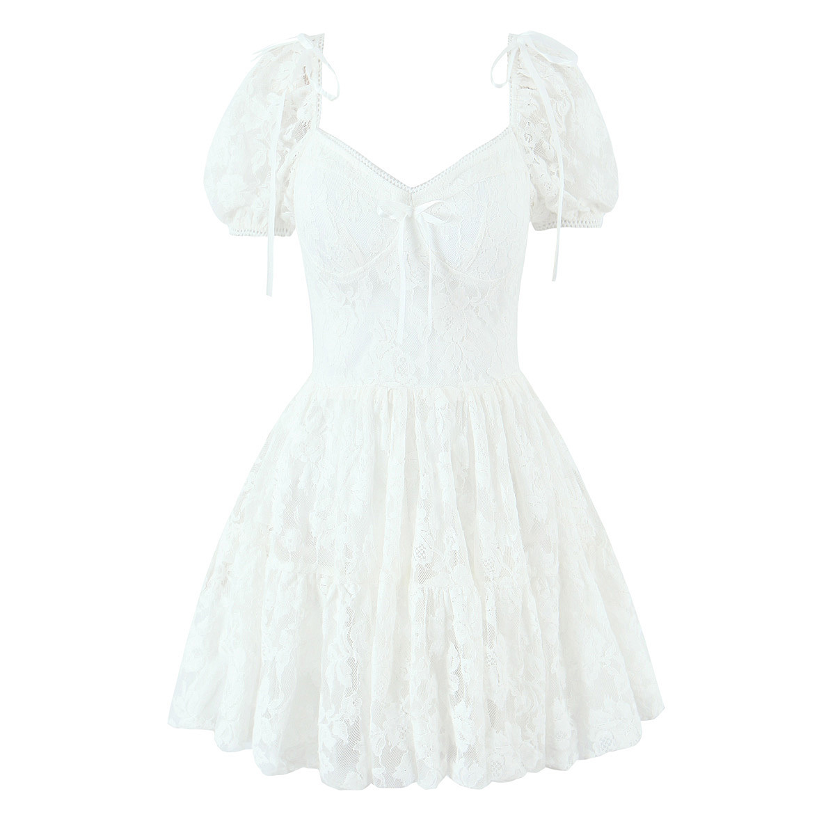 Lace Square Neck Three-Dimensional Small Flower Double-Layer Lace Hem Dress
