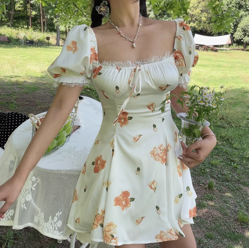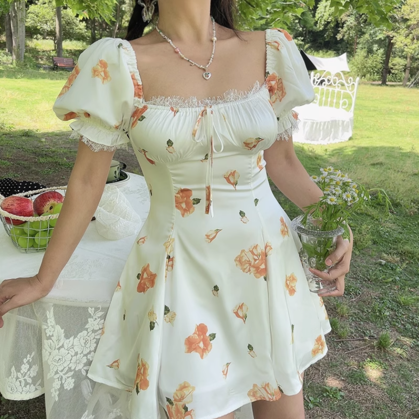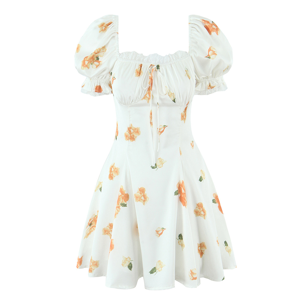 Pastoral style printed puff sleeve lace patchwork A-line skirt