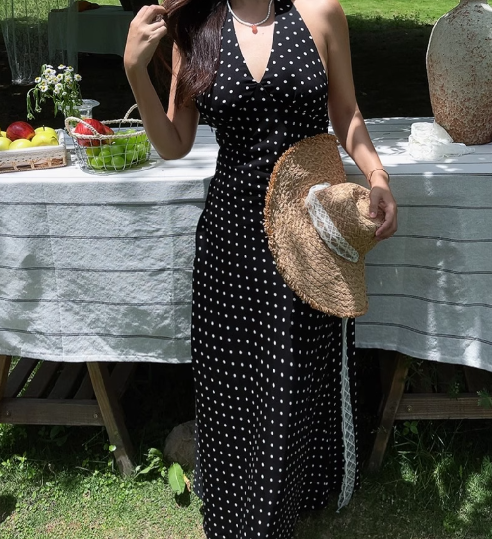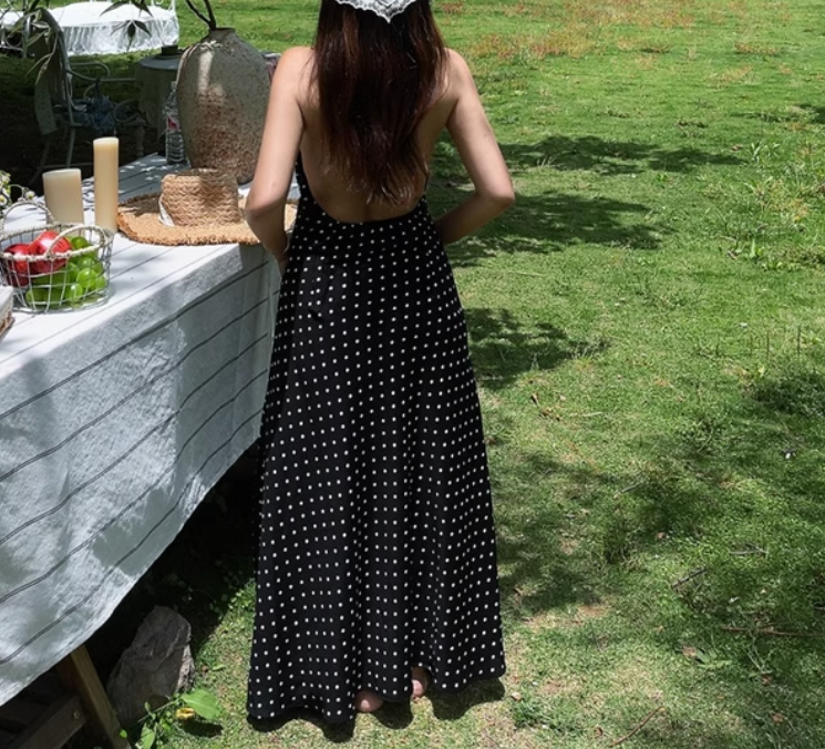 Sexy halter-neck sleeveless dress with a backpack and irregular hip design