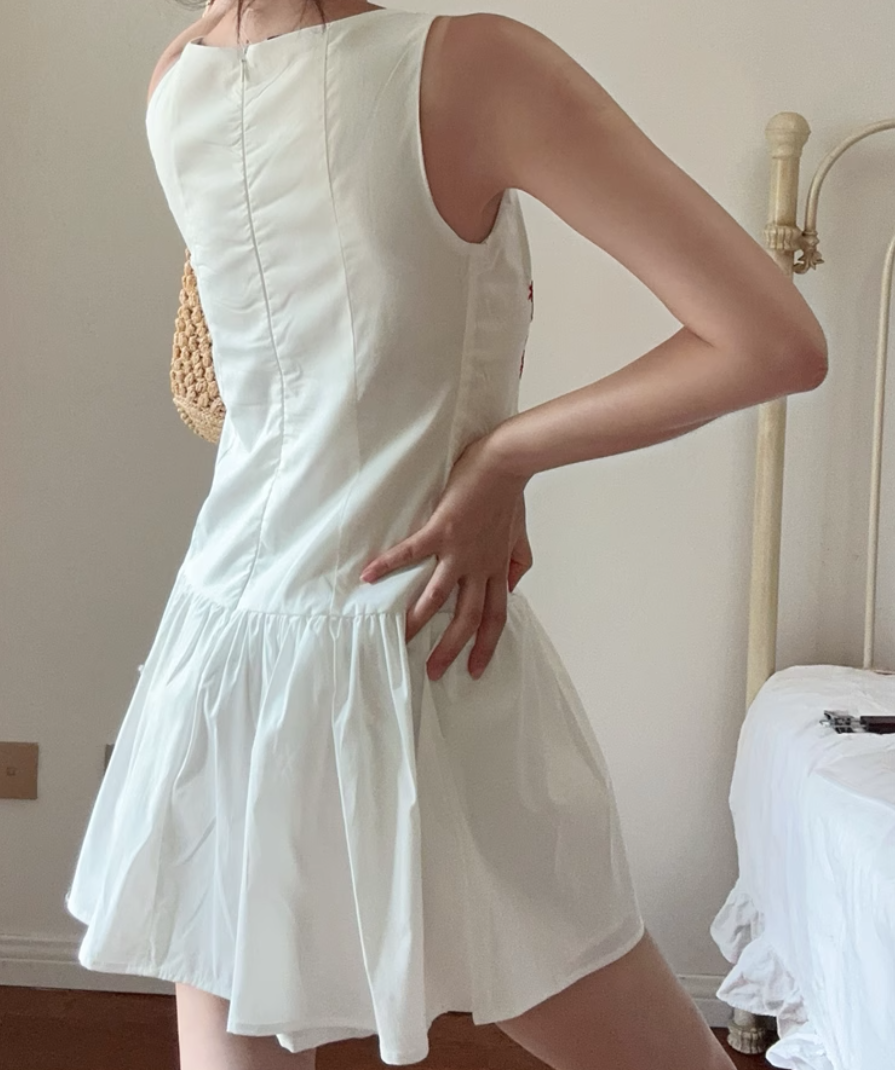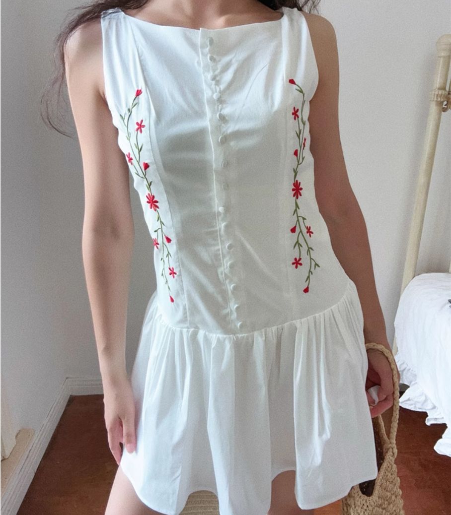 Fashionable and simple slim fit embroidered sleeveless front button dress