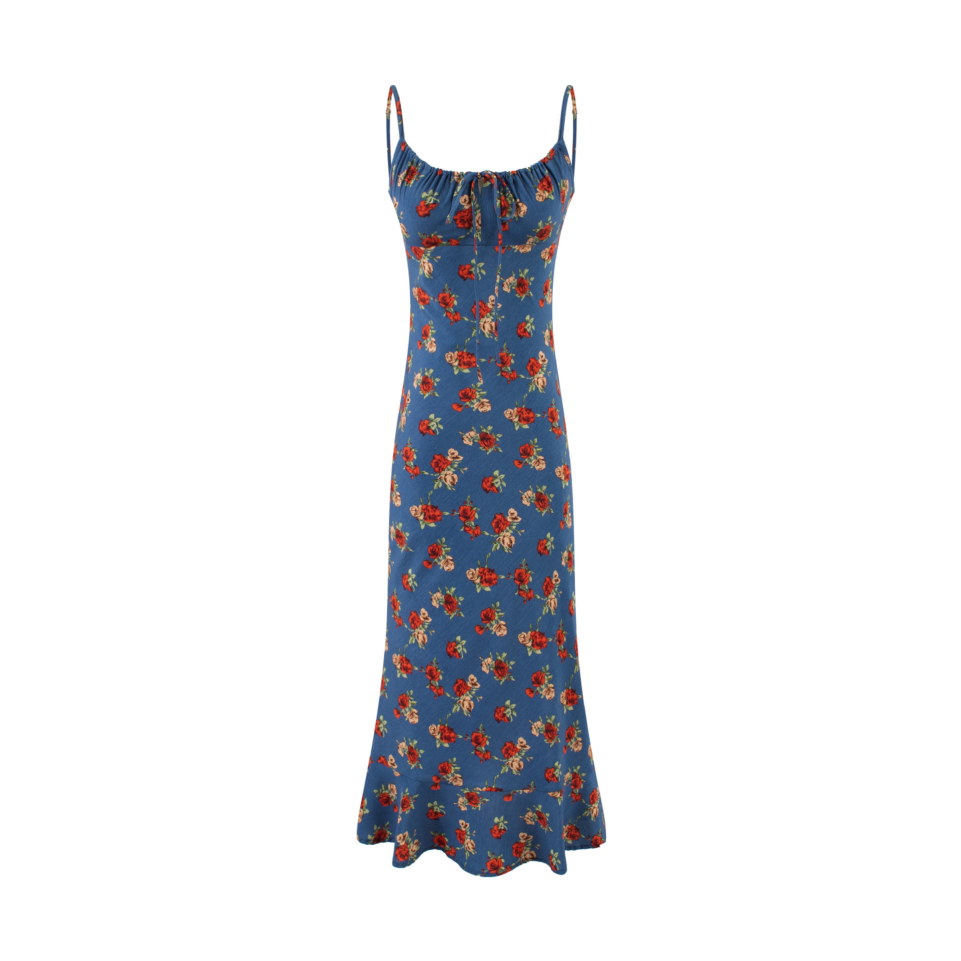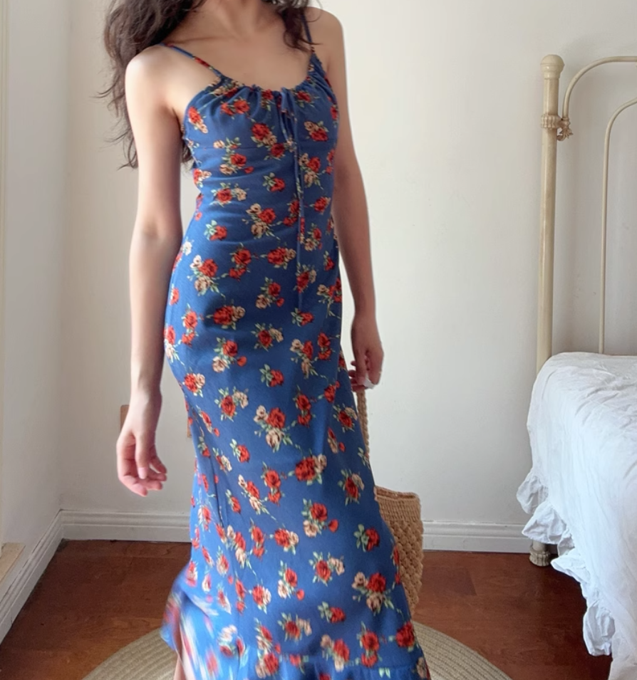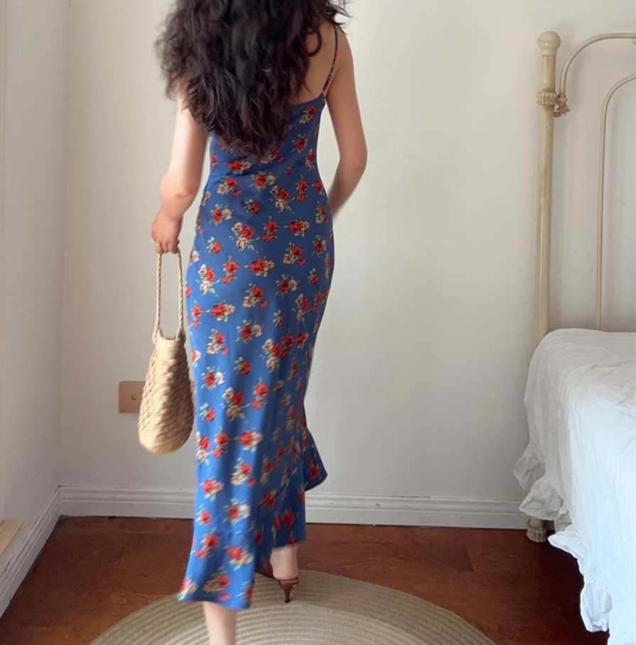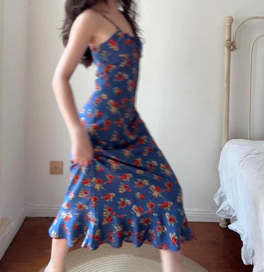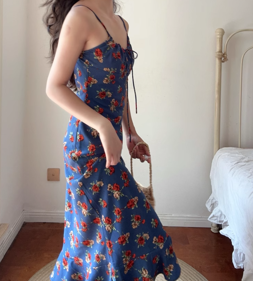 Retro Hong Kong style blue collar slim waist sleeveless floral suspender dress