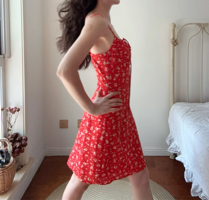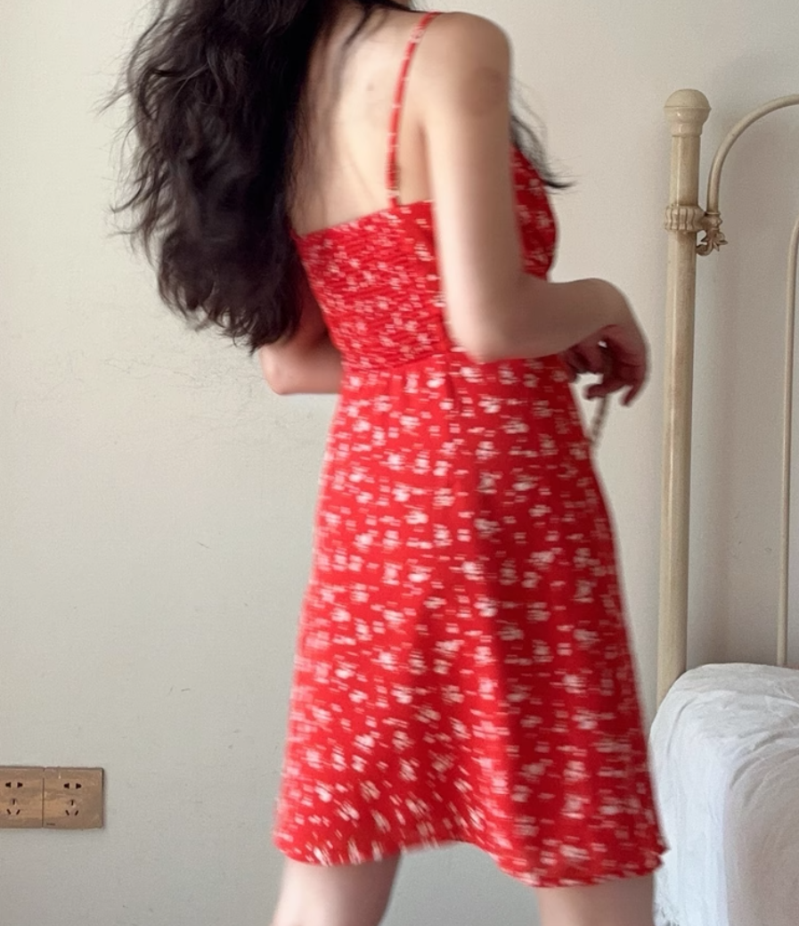 Casual chest drawstring dress with red floral pattern
