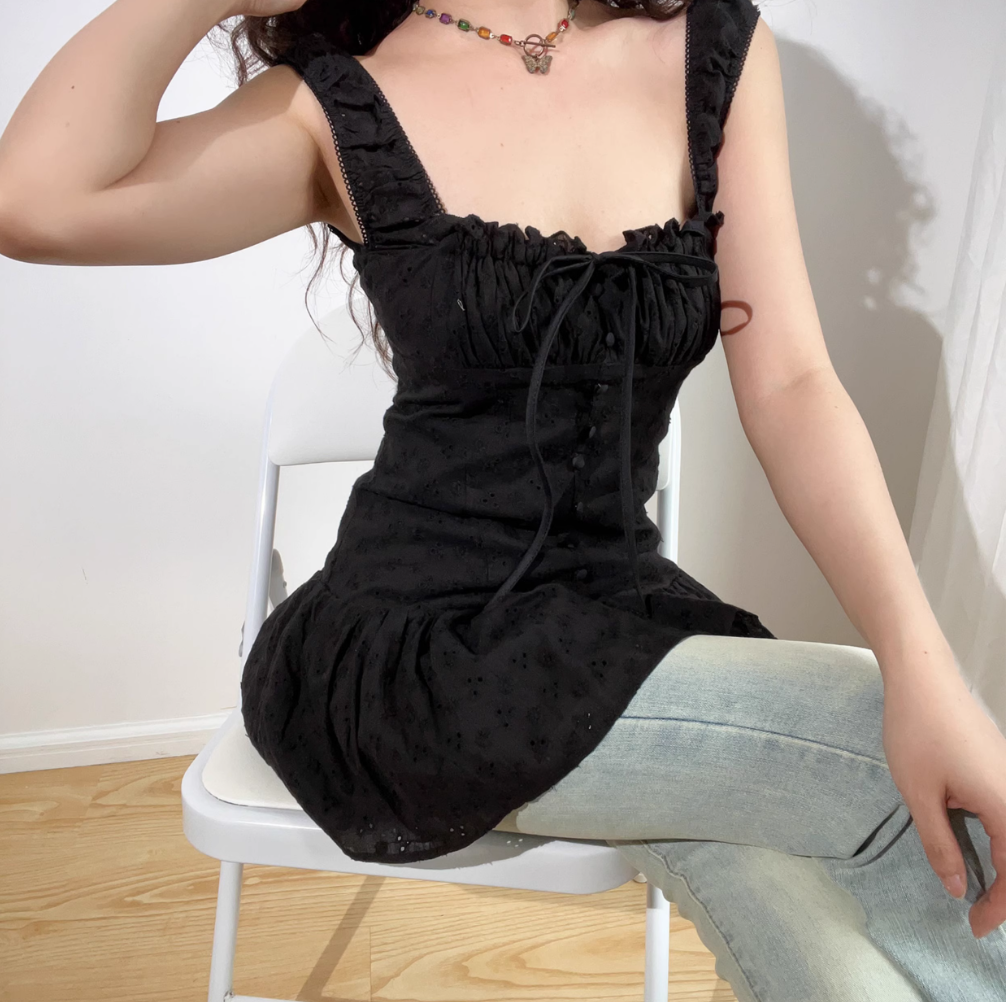 Retro French lace V-neck lace tie waist suspender dress