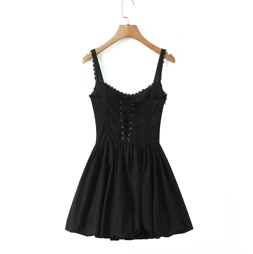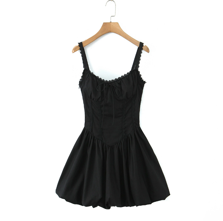 Lace-trimmed pleated puff sleeve short waist slimming skirt dress