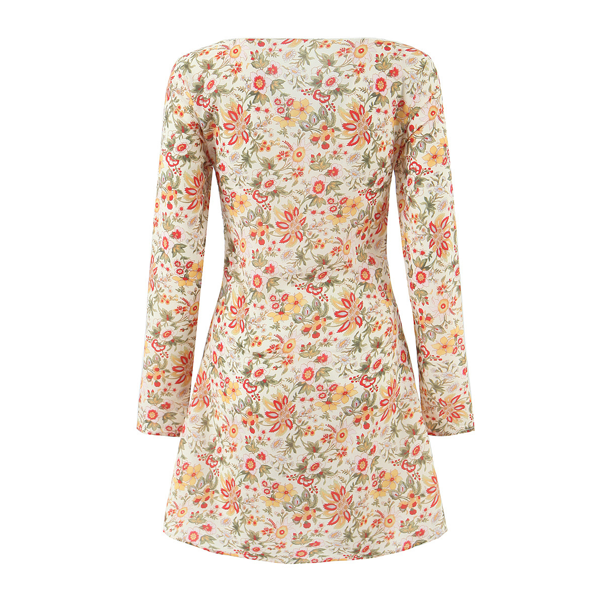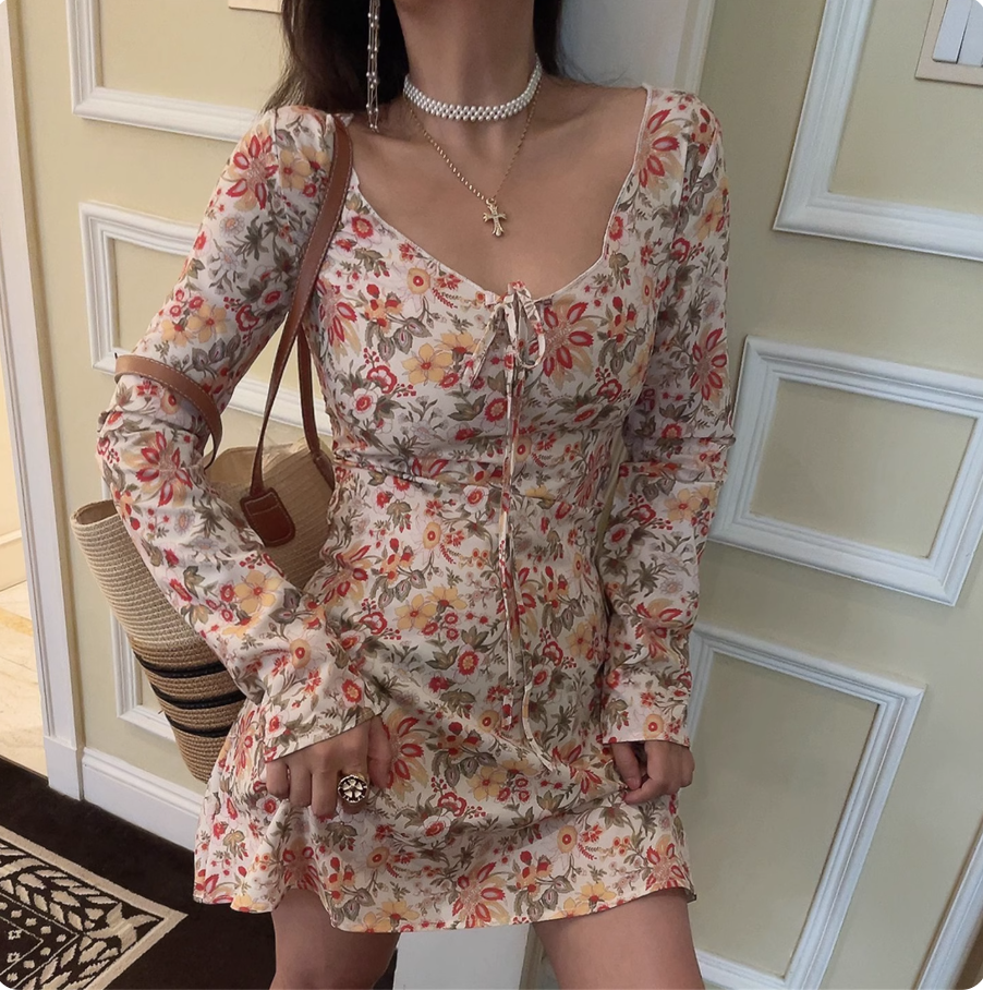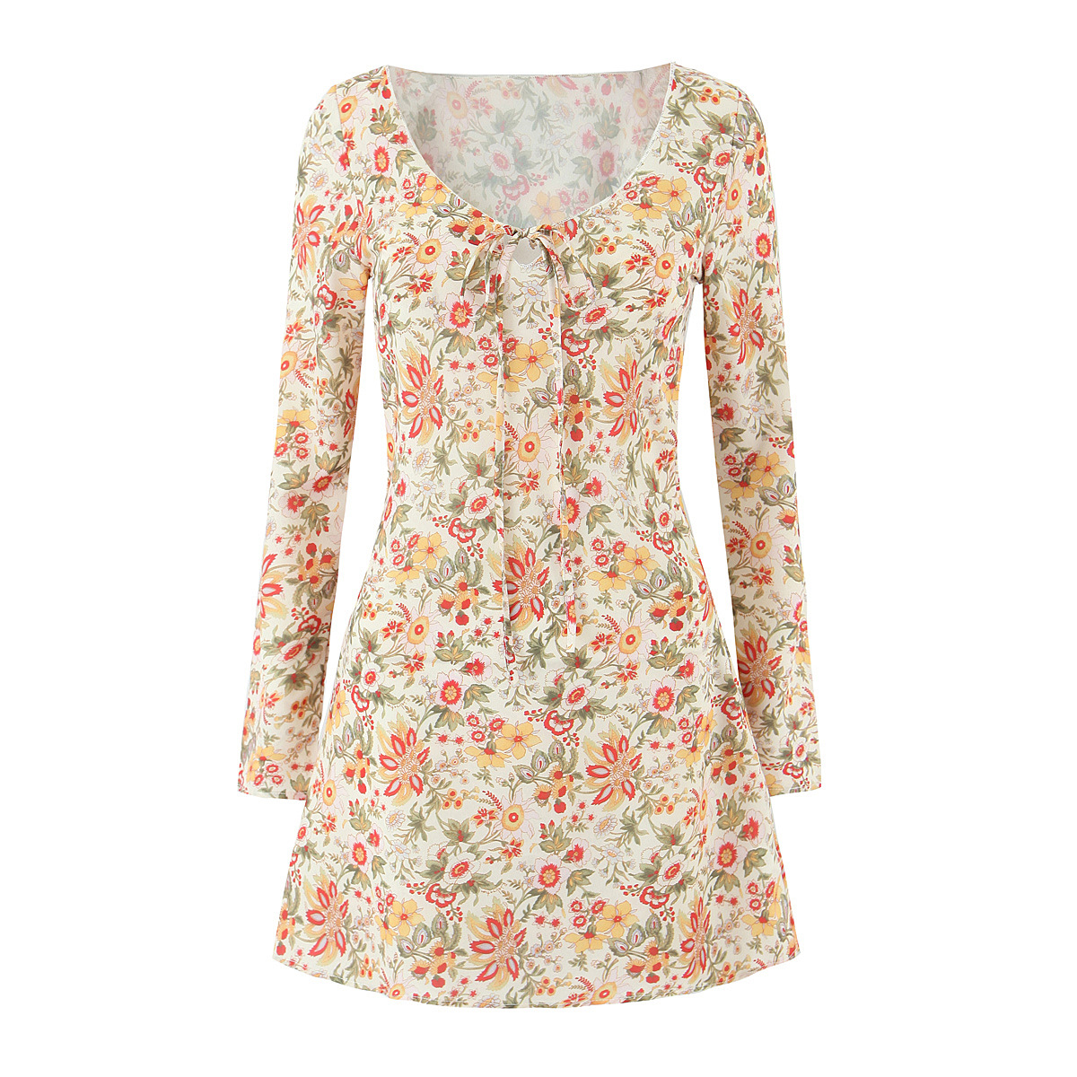 Retro romantic floral tie V-neck short A-line long-sleeved dress