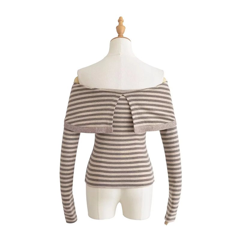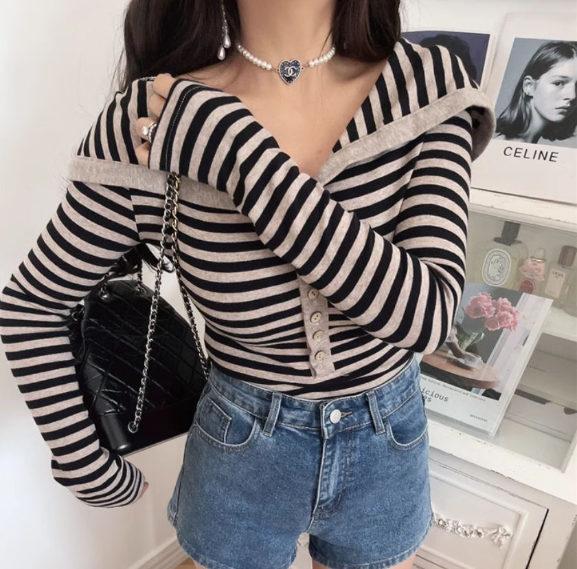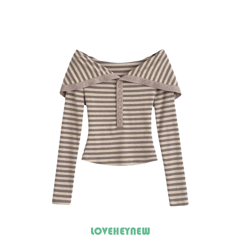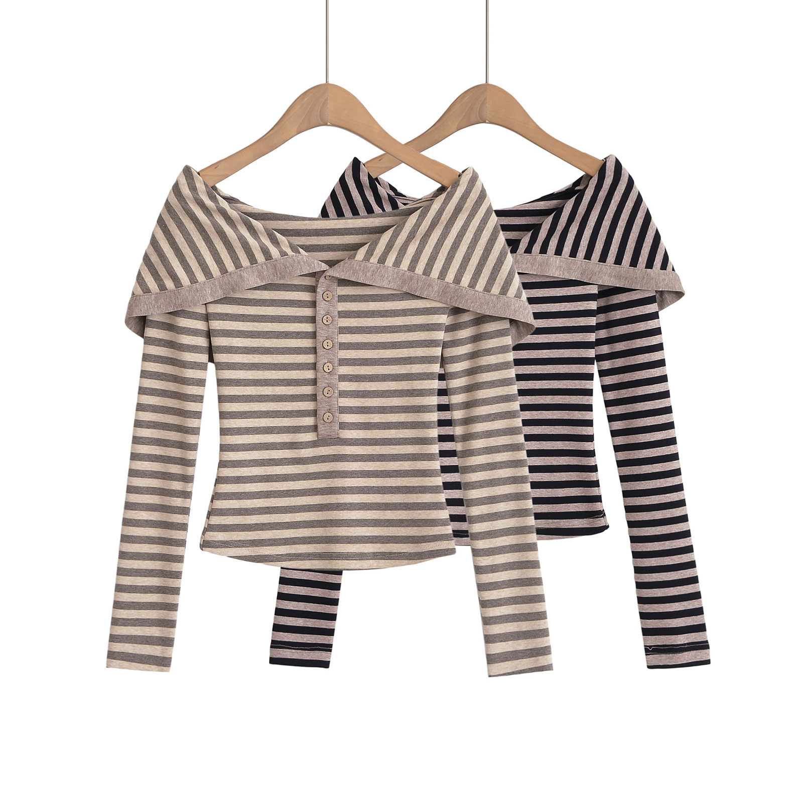 Off-shoulder button-down striped long-sleeved outerwear T-shirt
