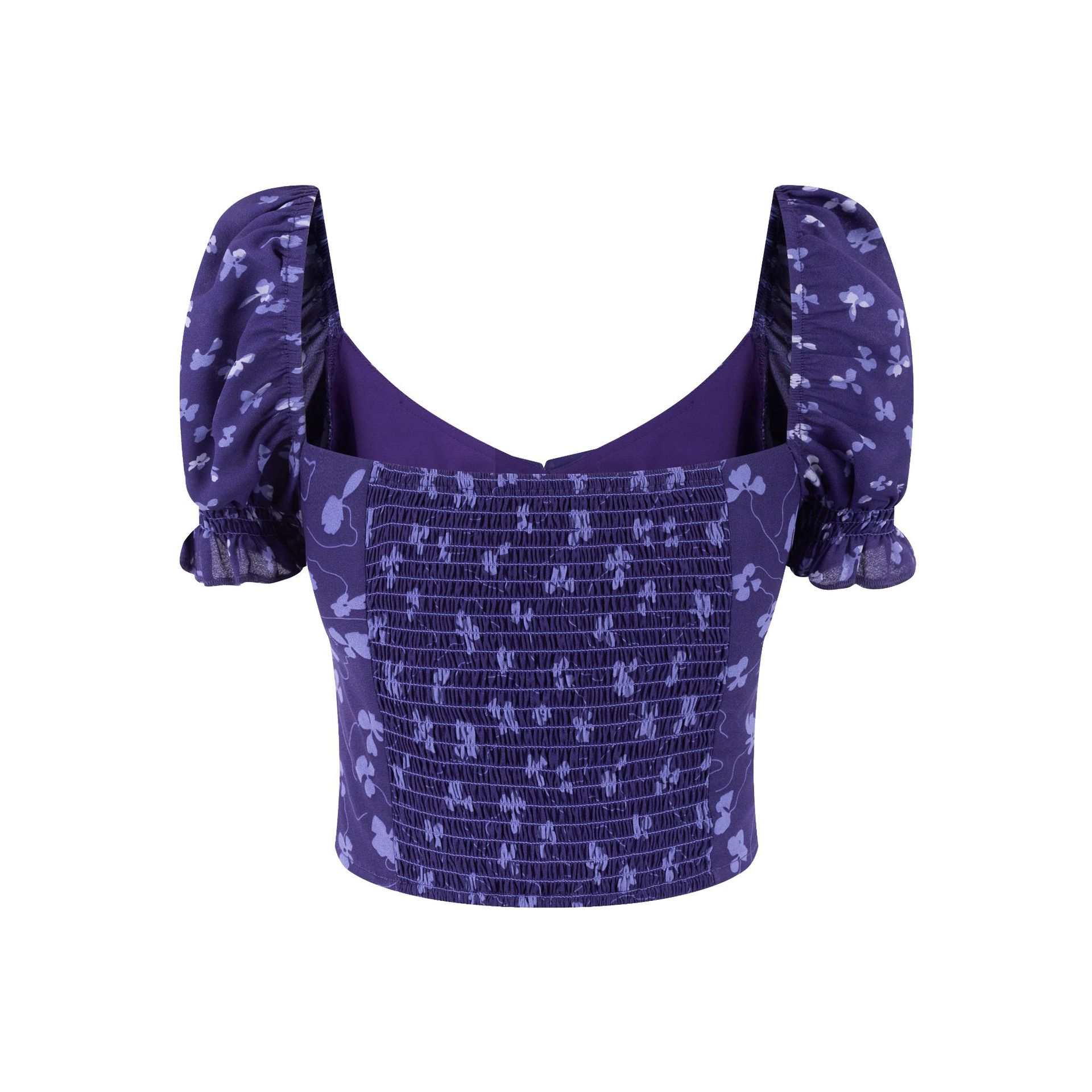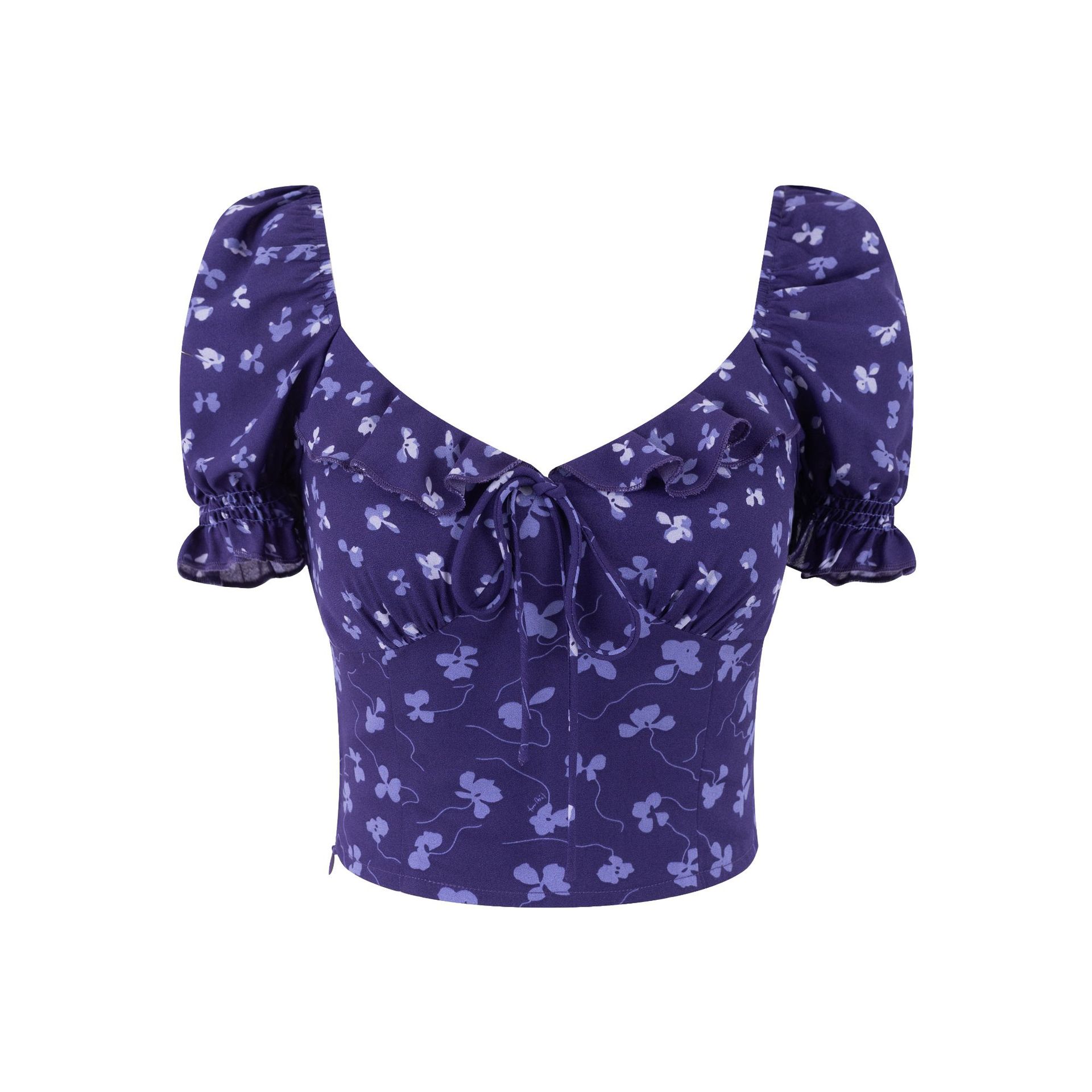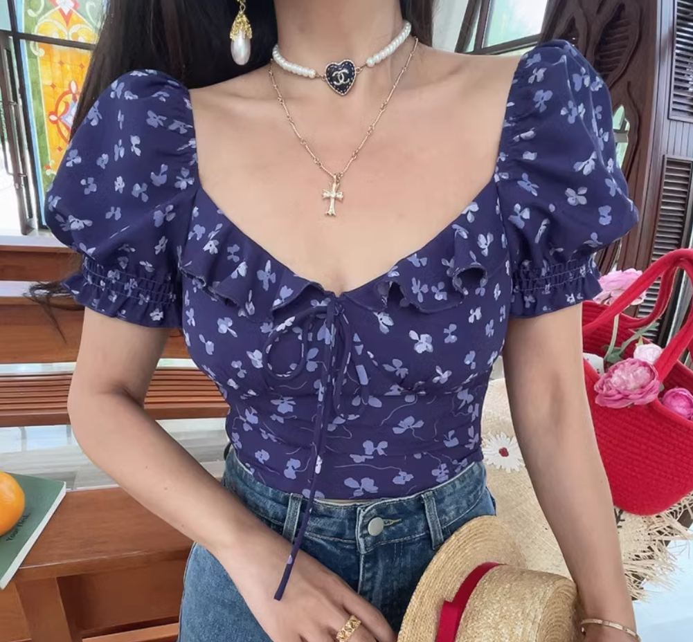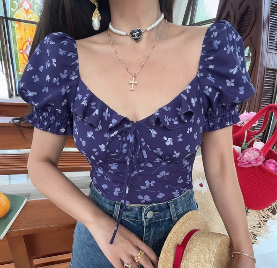 Retro style ruffled sexy square collar exposed collarbone strawberry print shirt