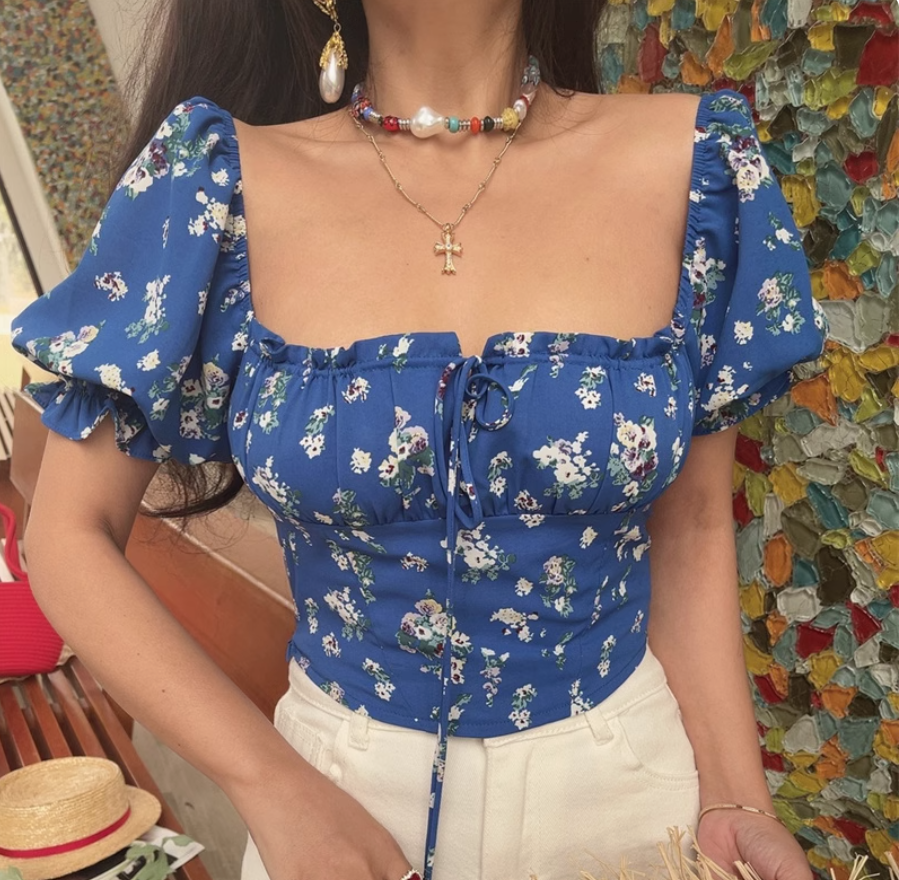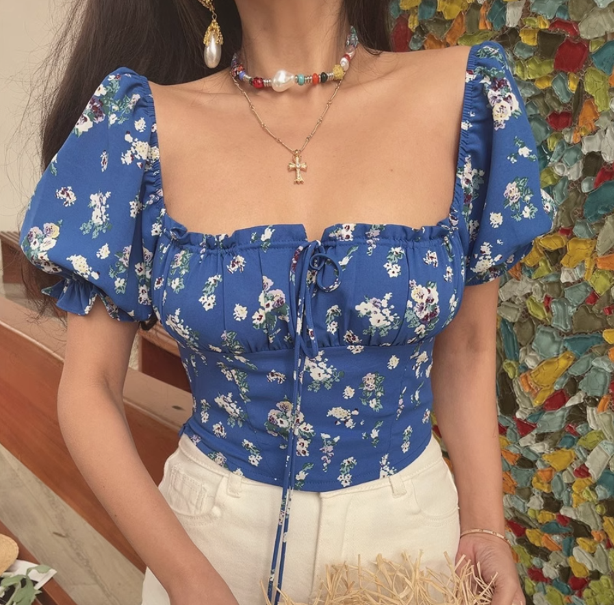 Retro palace style short style navel-baring floral lace-up square collar short-sleeved shirt
