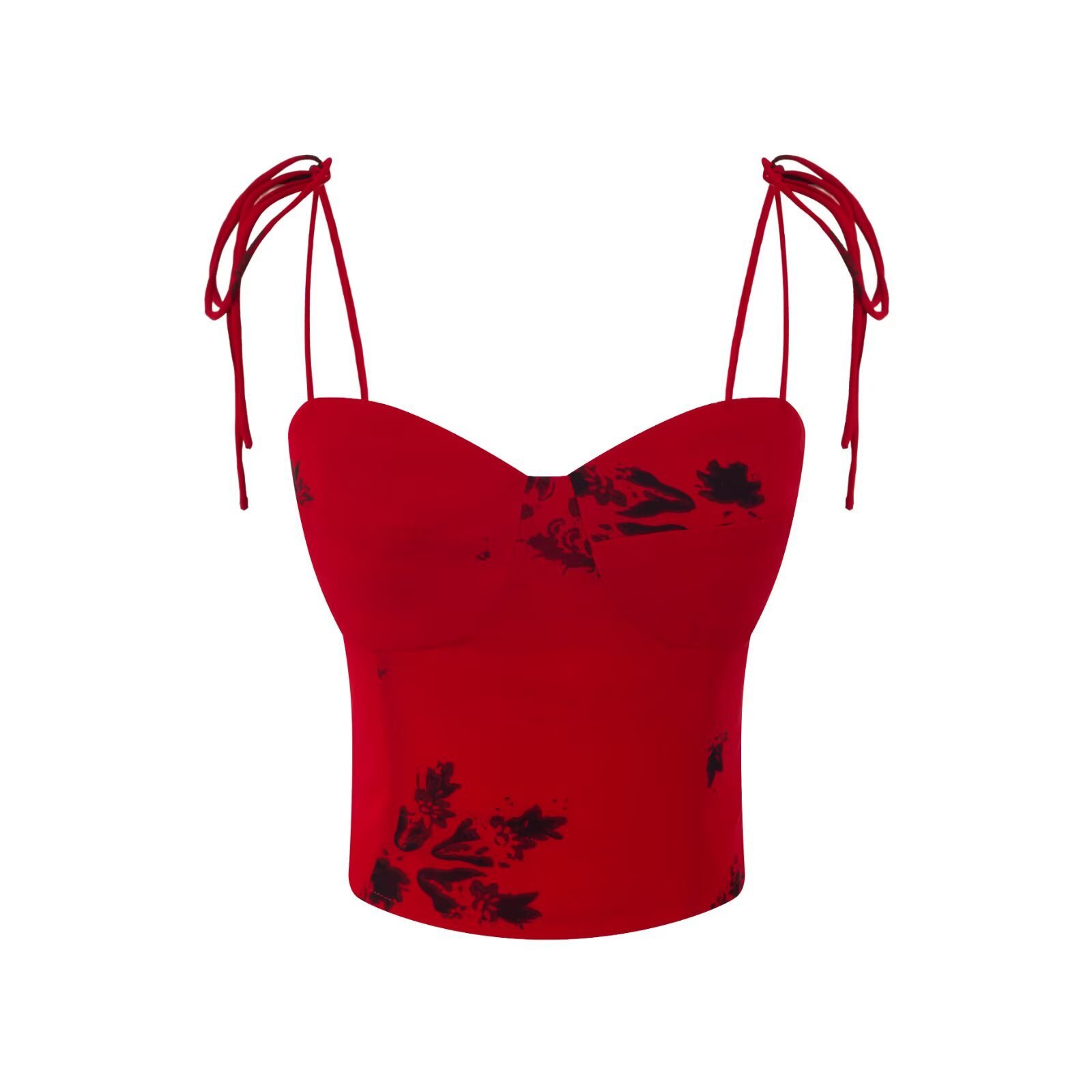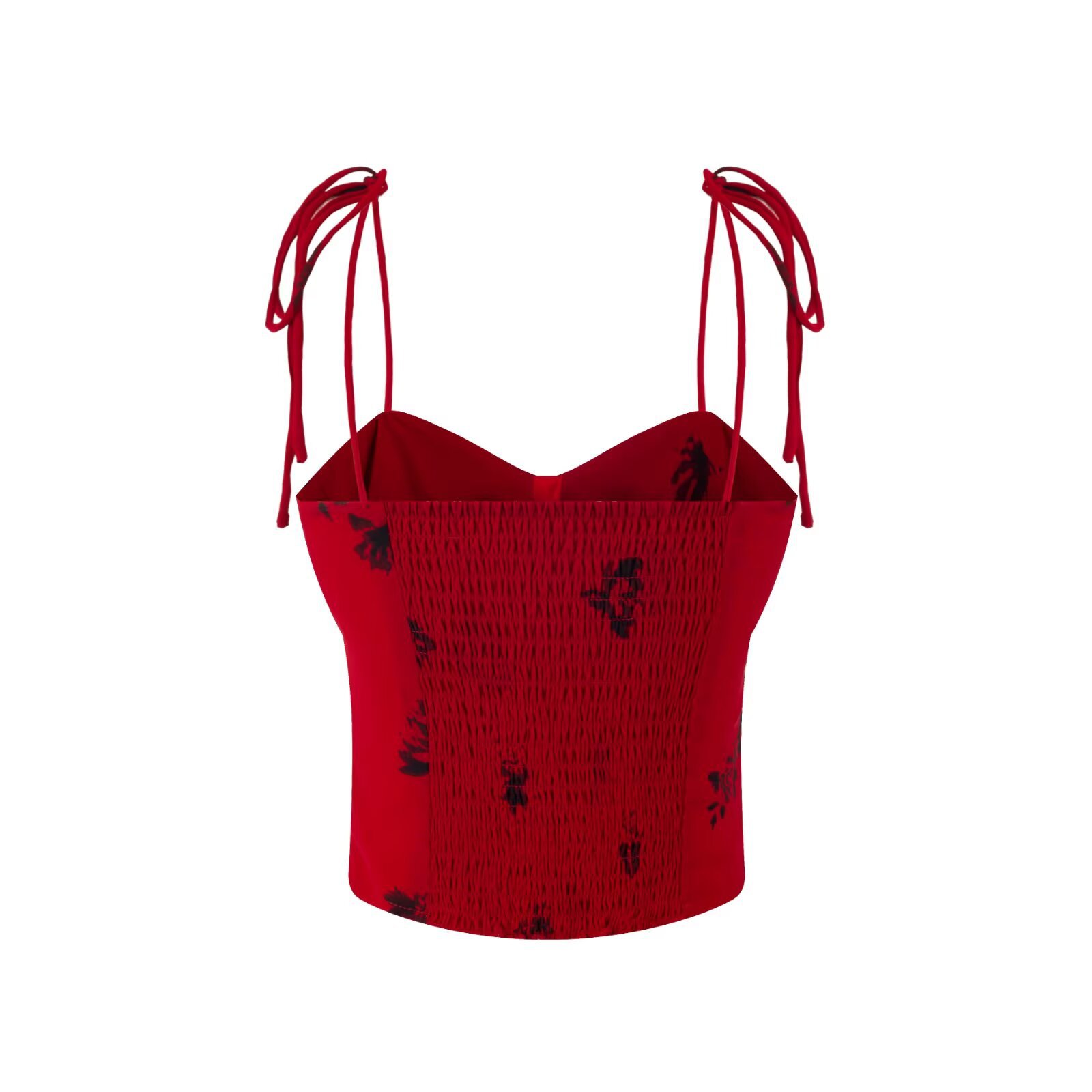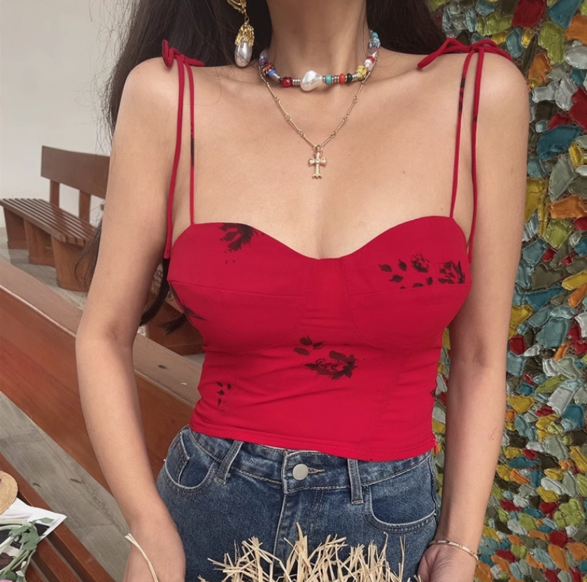 Retro style ruffled sexy square collar exposed collarbone strawberry print shirt