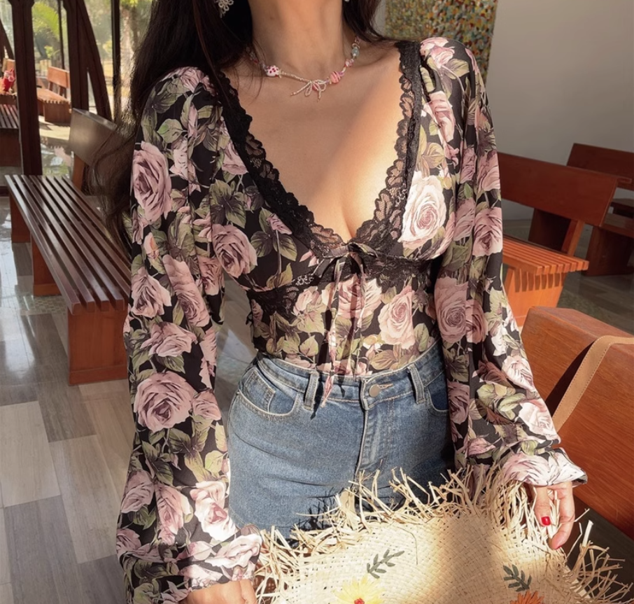 Solid color lace shirt with brushed lace inner long-sleeved lace-up bottoming shirt