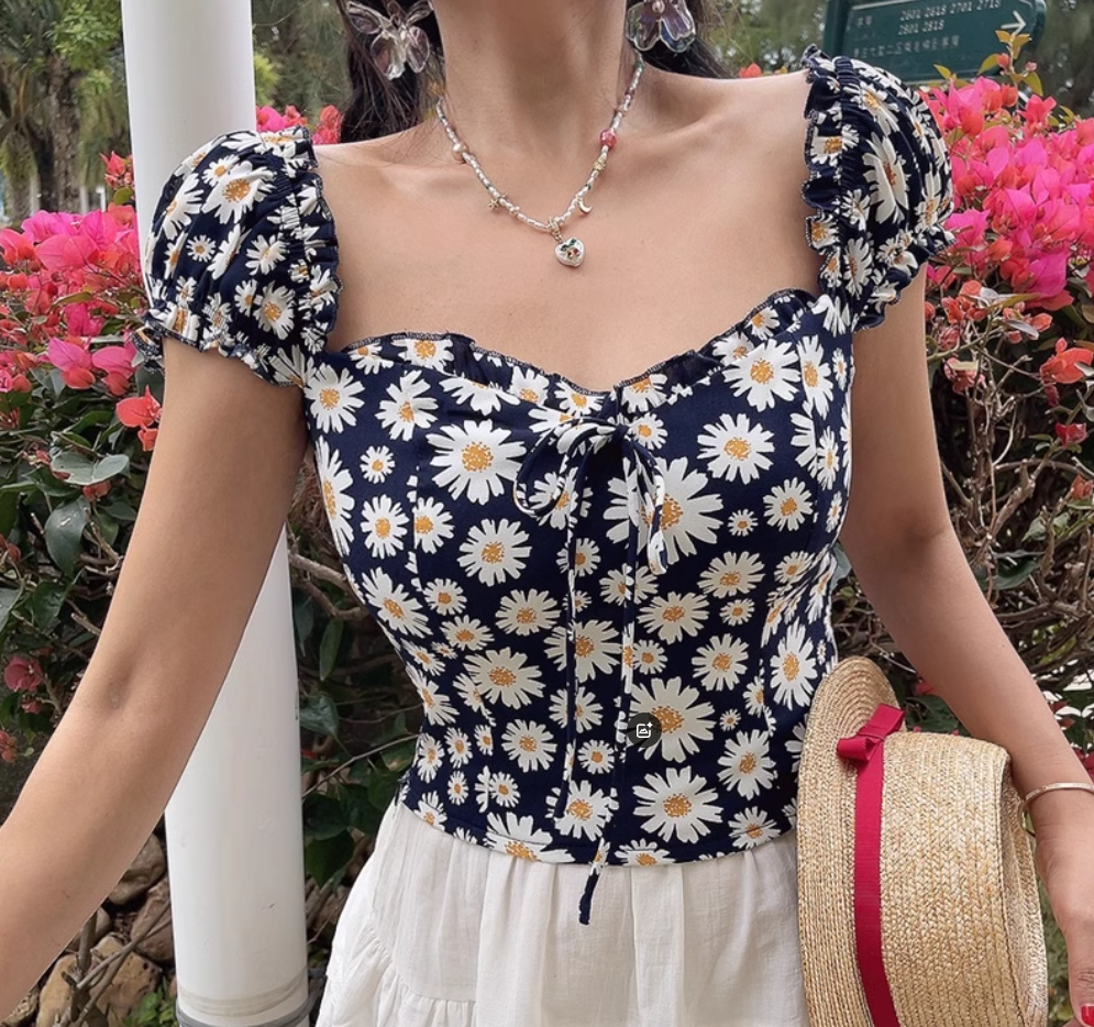 Retro pastoral style printed square neck puff sleeve slim fit top