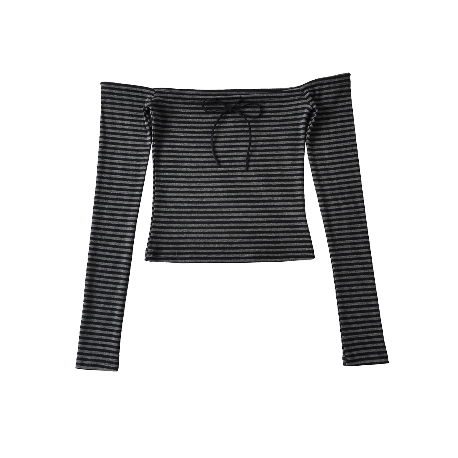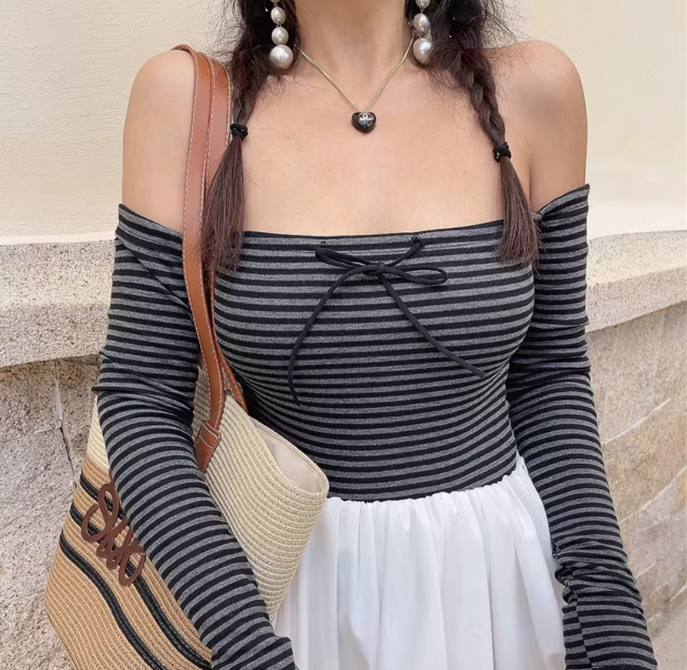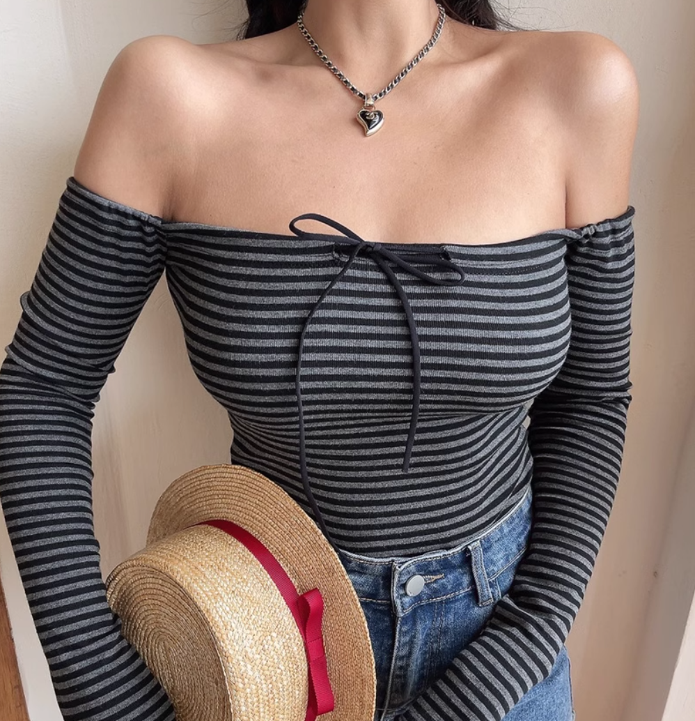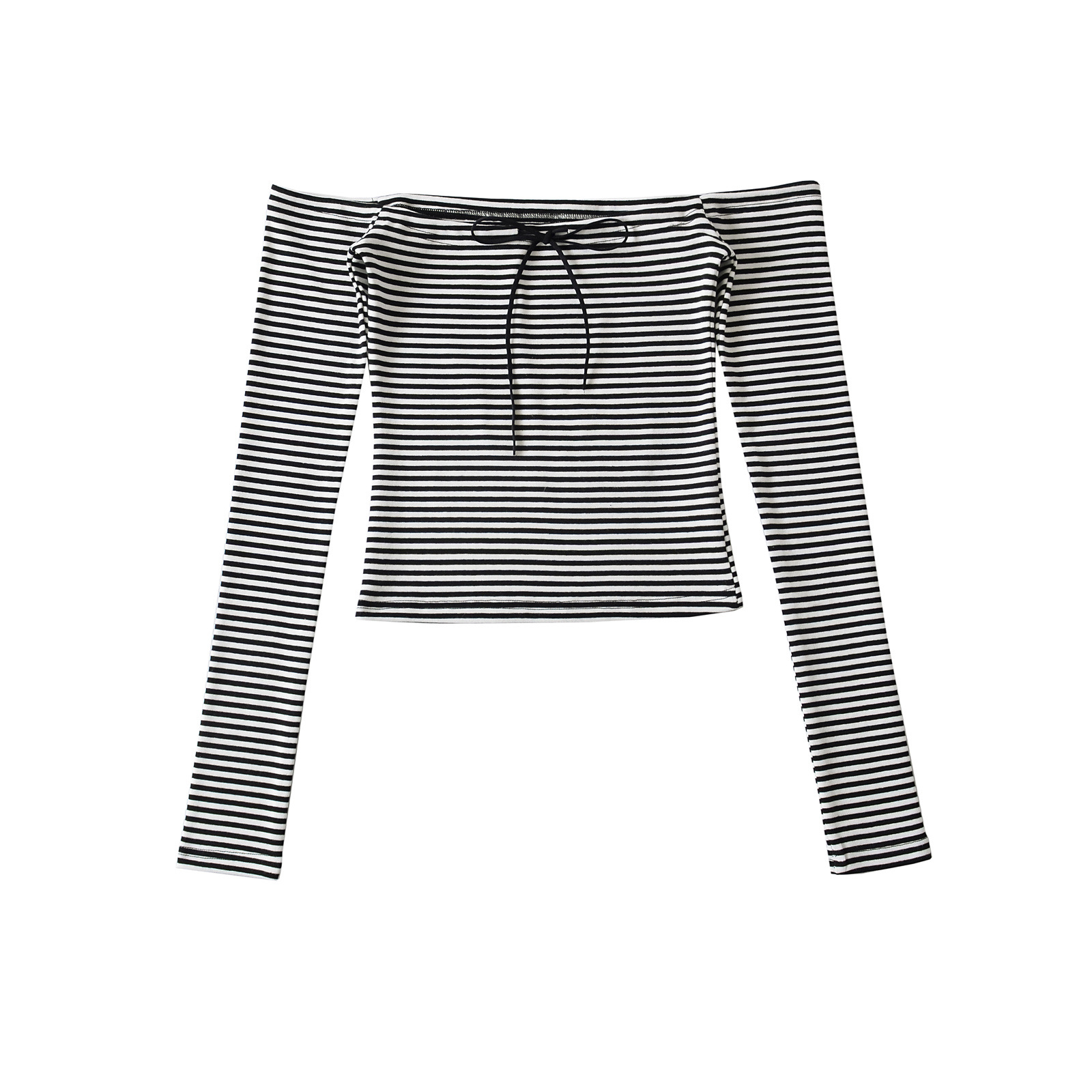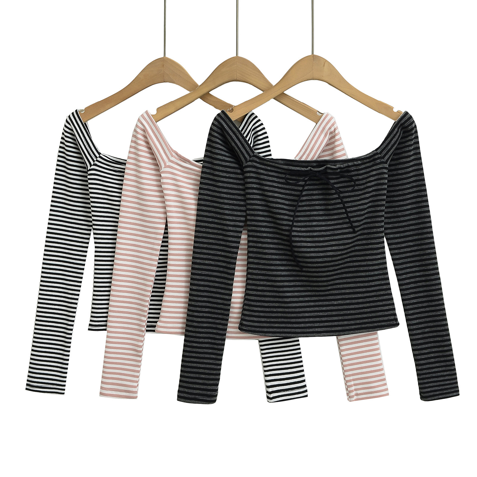 Off-shoulder striped long-sleeved slim-fit top bottoming shirt T-shirt