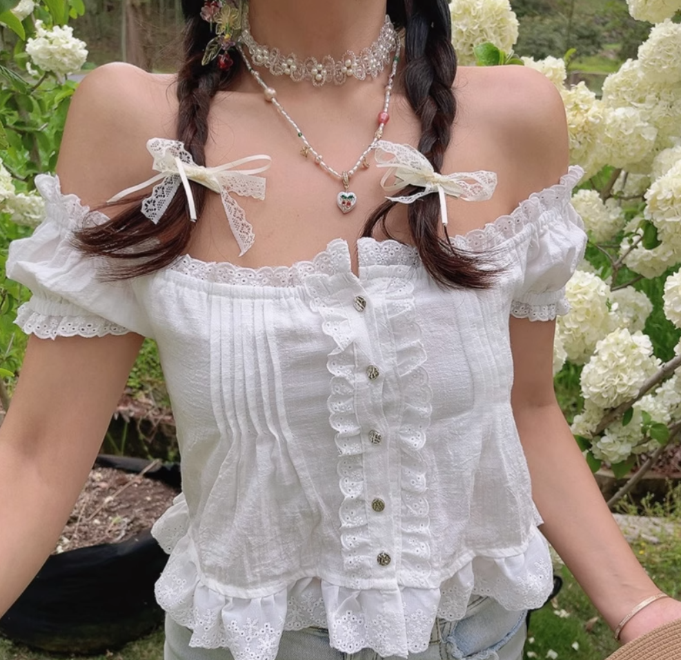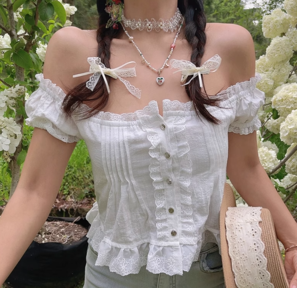 Retro romantic lace casual square neck lace sexy super short T-shirt