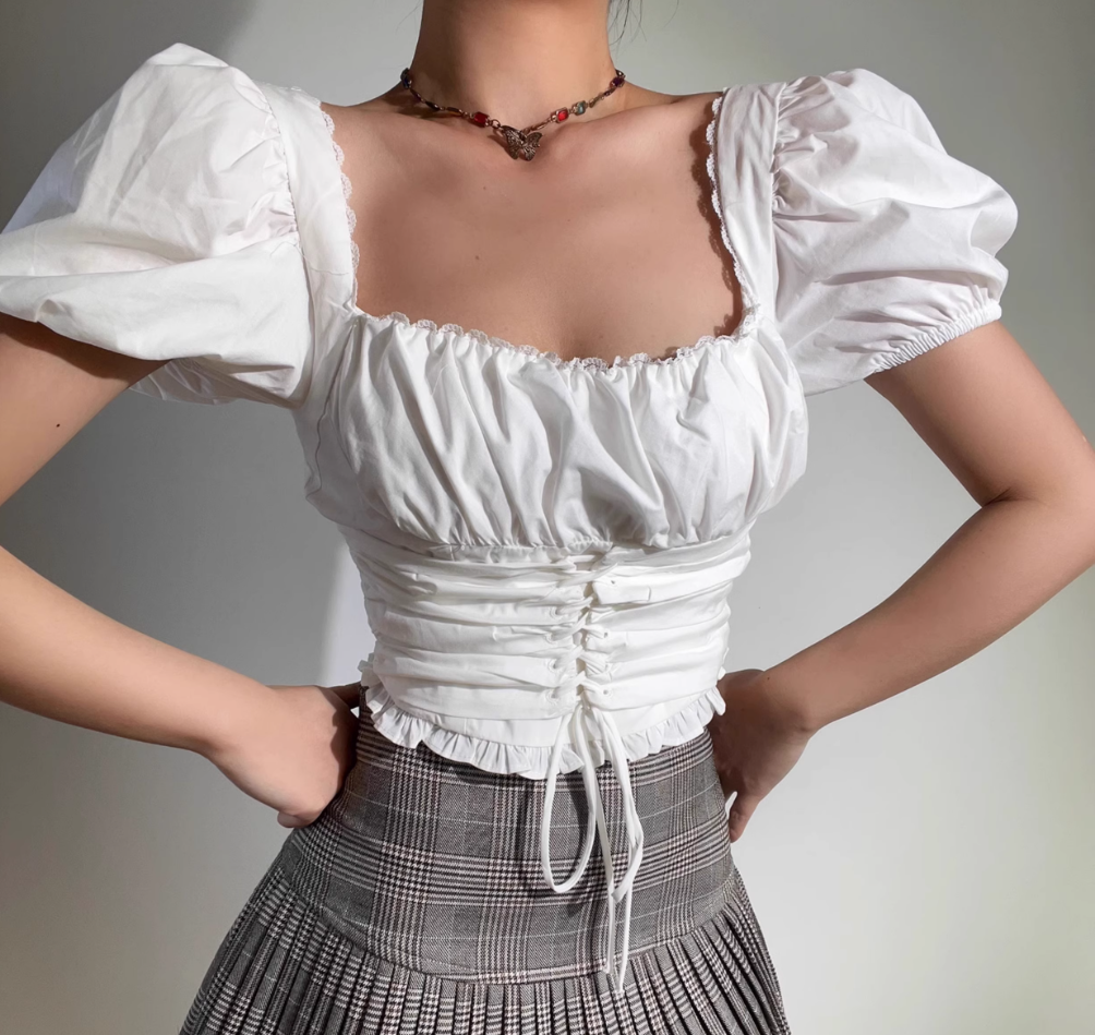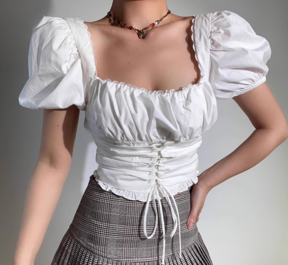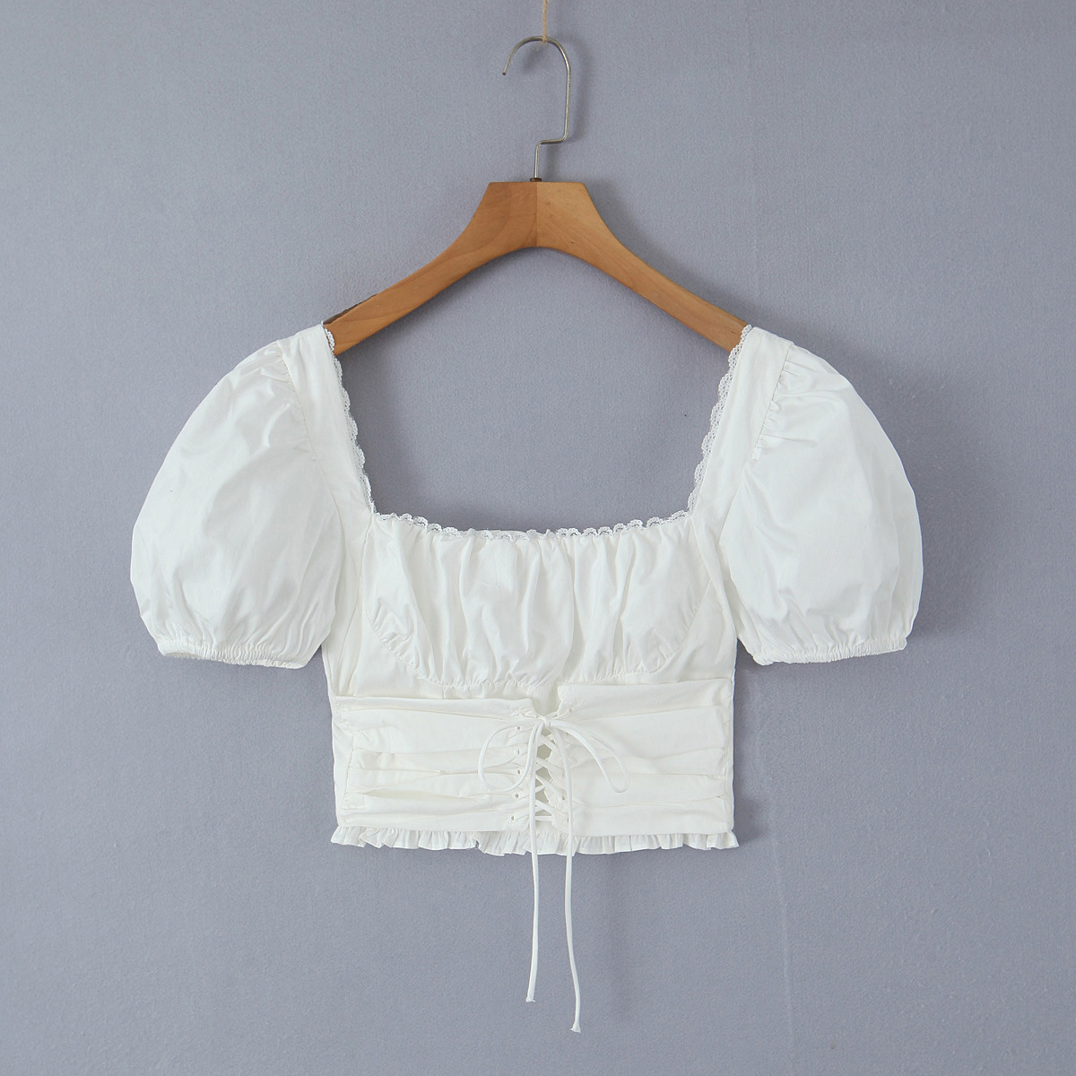Square Neck Puff Sleeve White Sexy Short Navel-Baring Waist Shirt