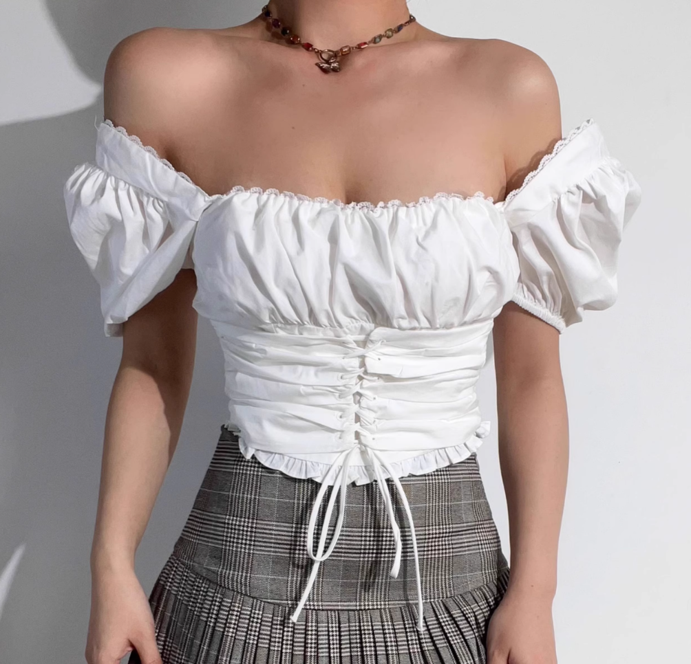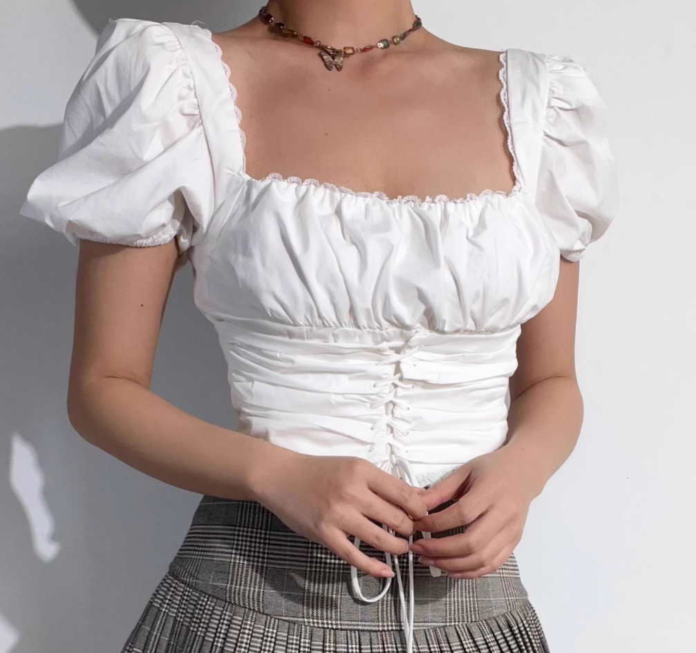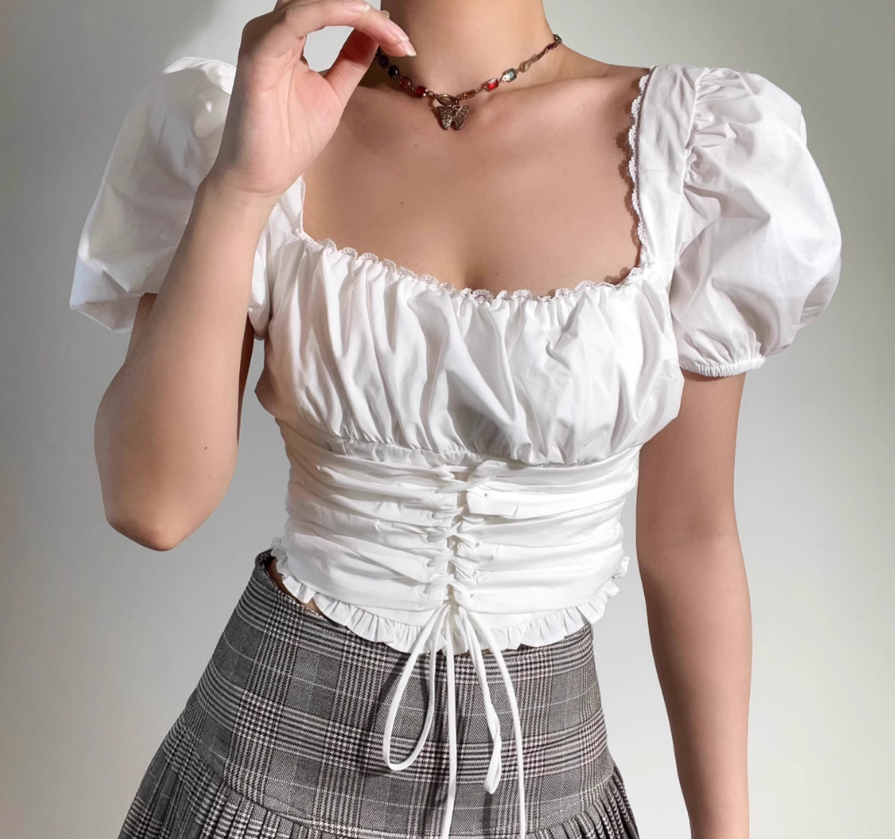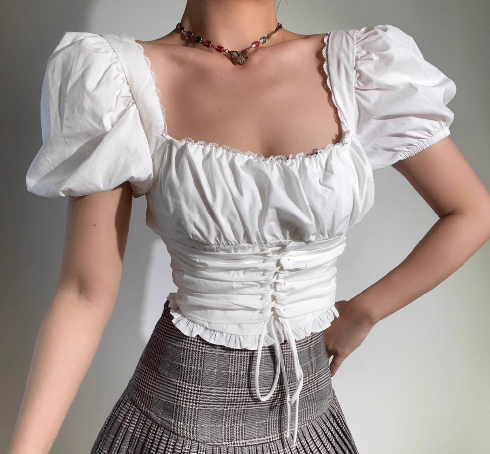 Square Neck Puff Sleeve White Sexy Short Navel-Baring Waist Shirt