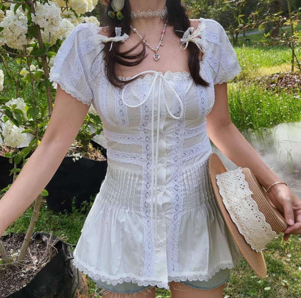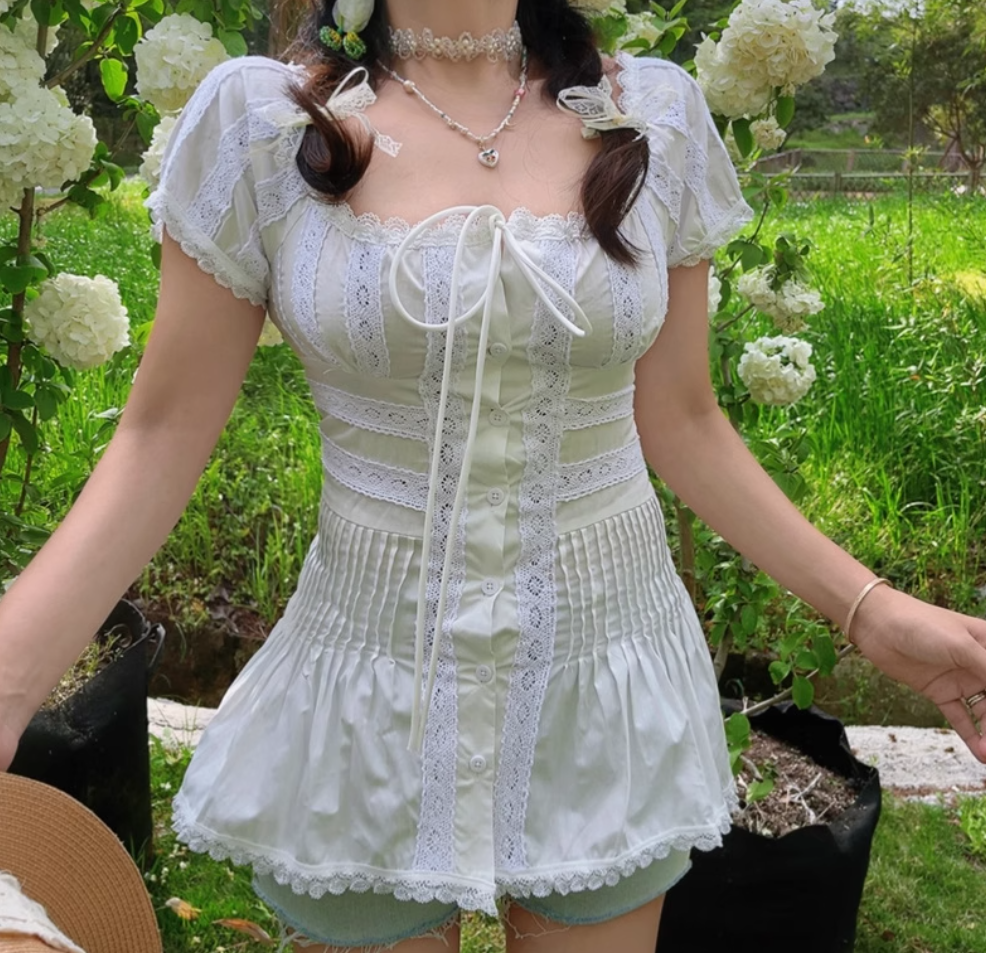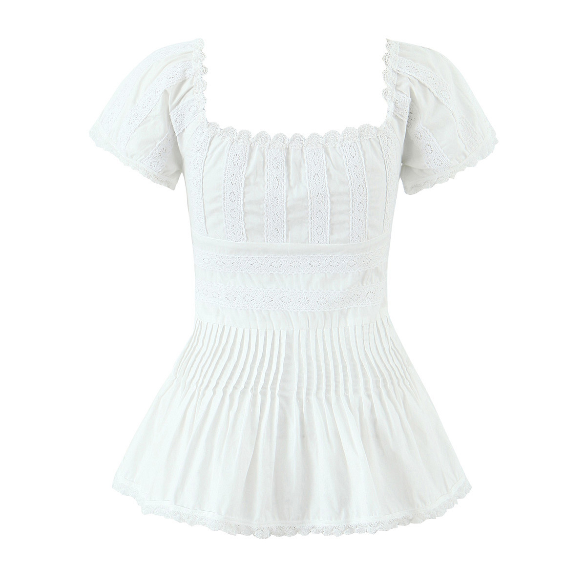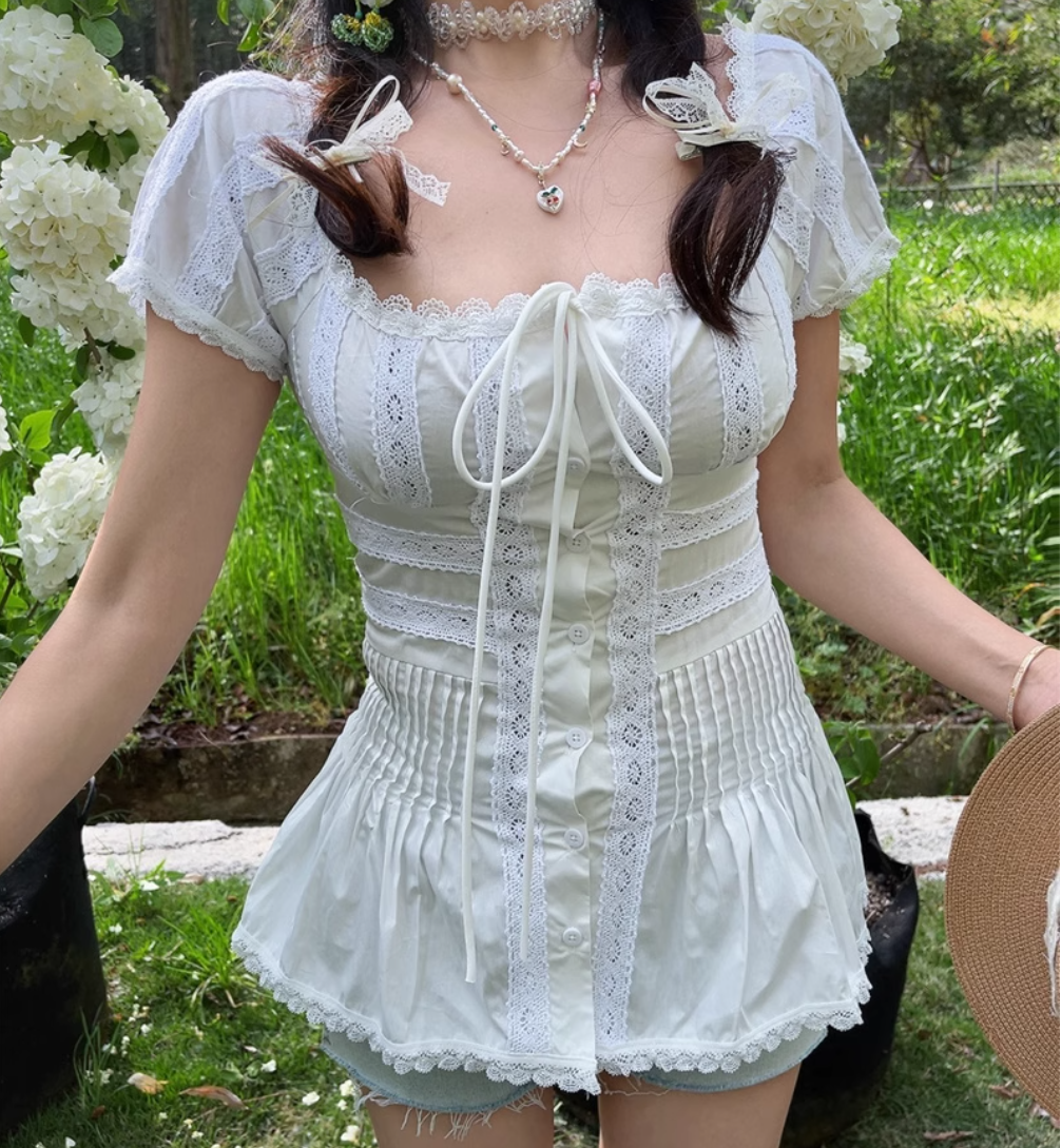 Heavy lace square neck patchwork slim fit pleated top
