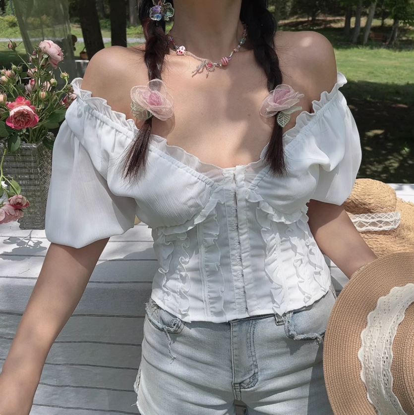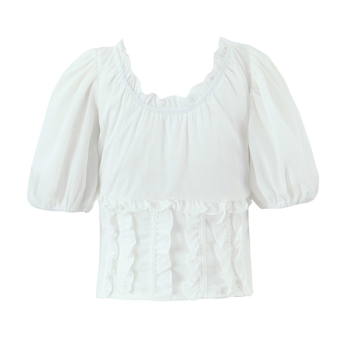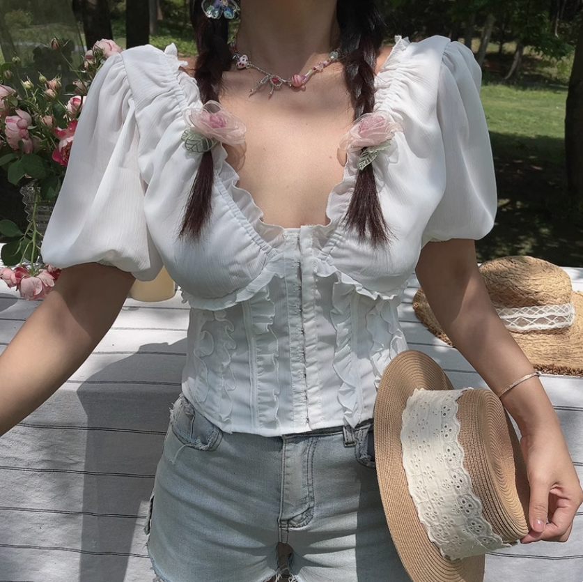 Retro pastoral style printed square neck puff sleeve slim fit top