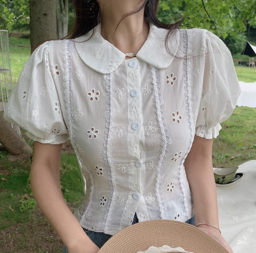 Retro doll collar bow tie hollow embroidery short-sleeved puff sleeve white top