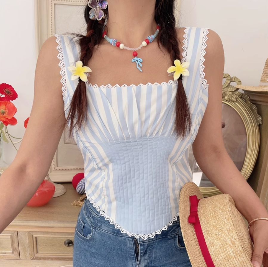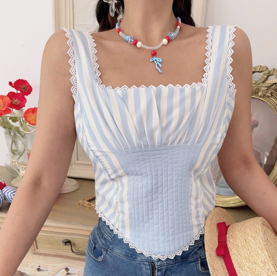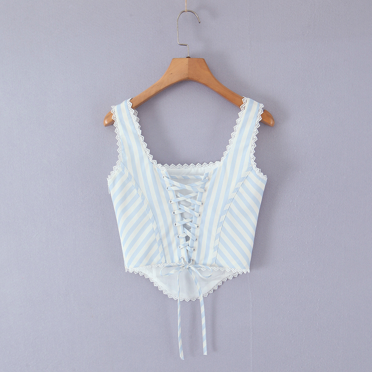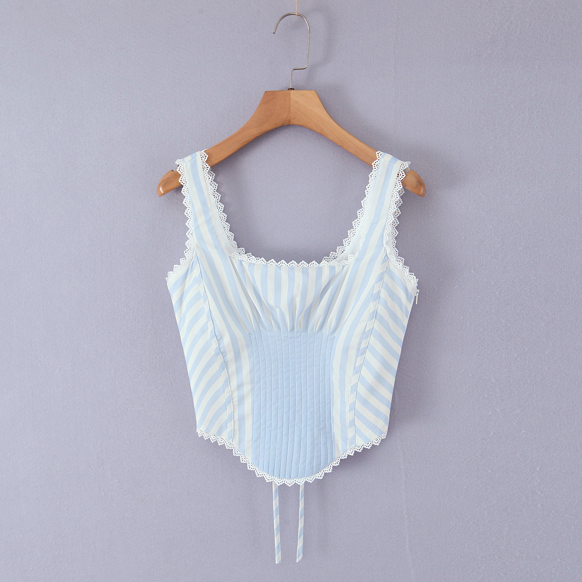 Square Neck Lace Pleated Back Tie Slim Striped Vest