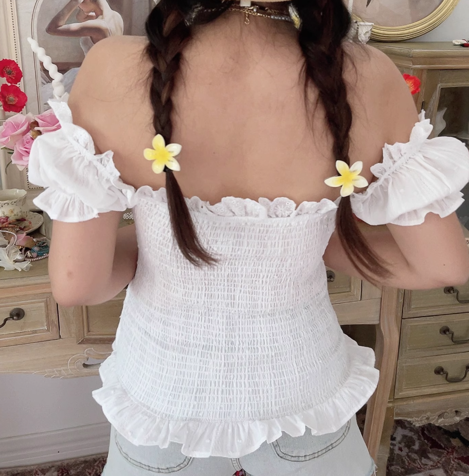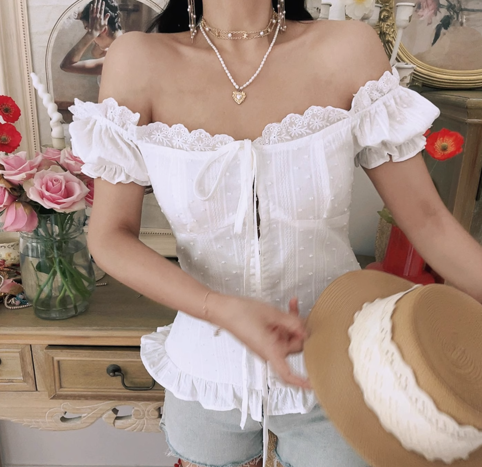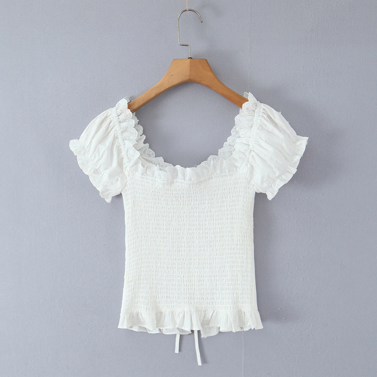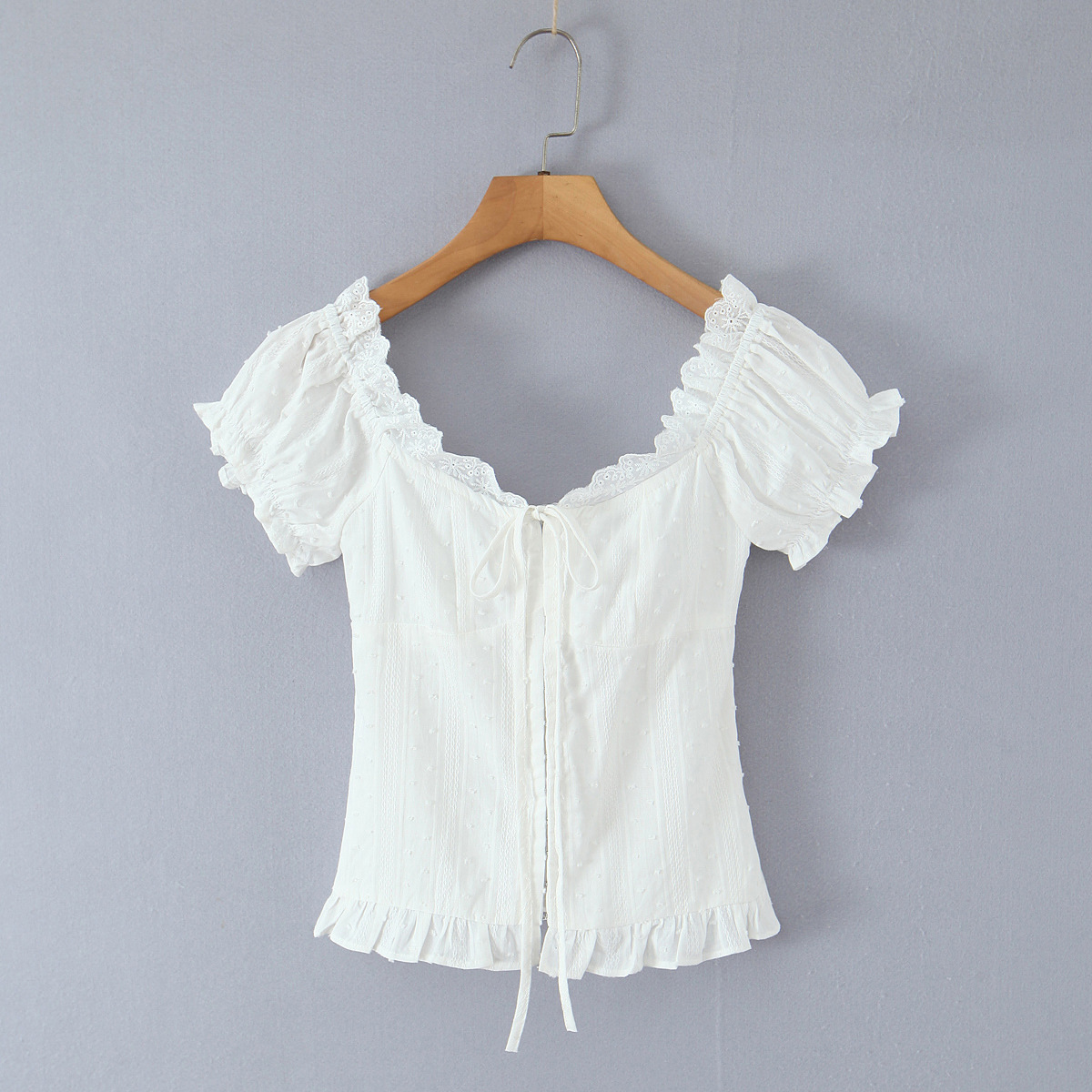 White lace collar elastic back jacquard polka dot puff sleeves small shirt