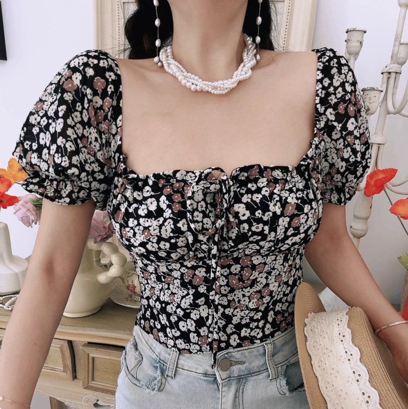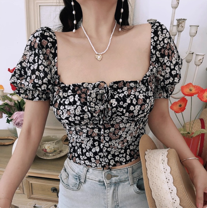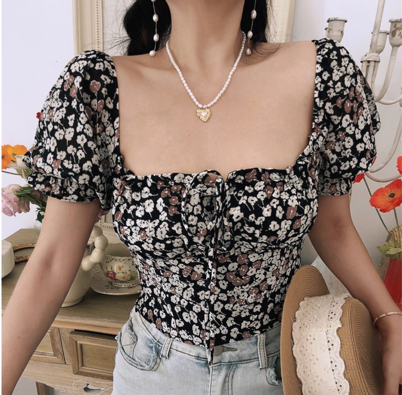 Retro Bohemian style floral blouse summer square neck tie short sleeve T-shirt