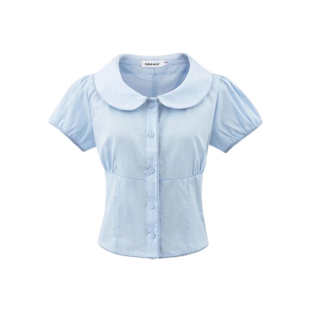 Doll collar shirt solid color age-reducing puff sleeve waist tie short blouse