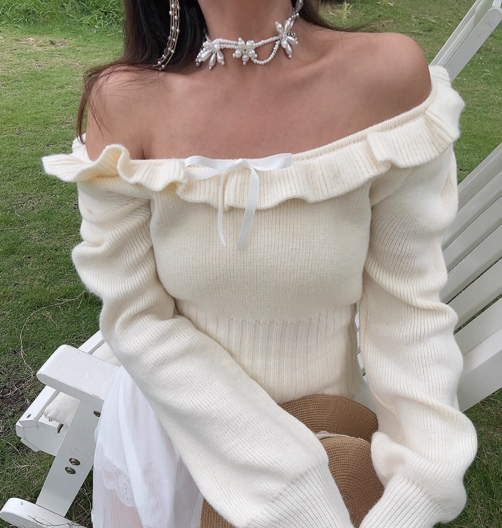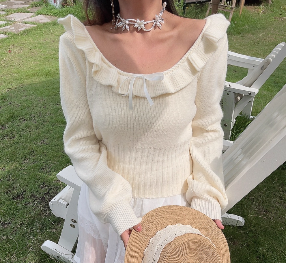 Lace collarbone exposed round neck ribbon bow knitted sweater