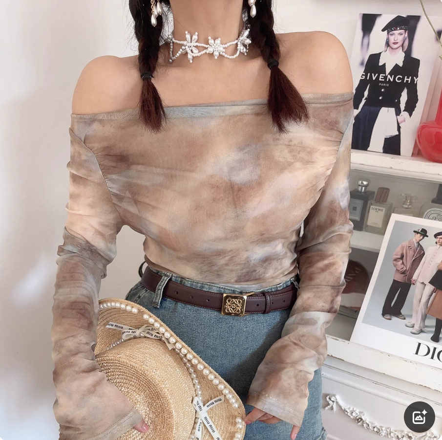Tie-dye printed personalized off-shoulder long-sleeved mesh T-shirt
