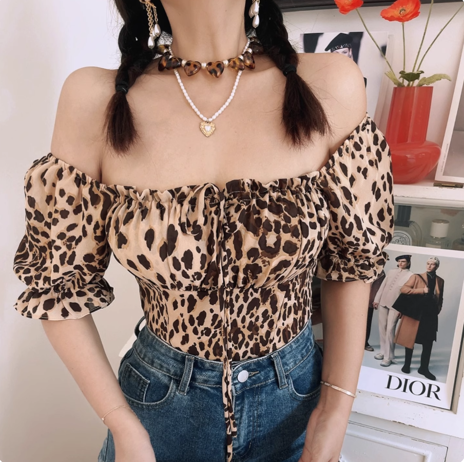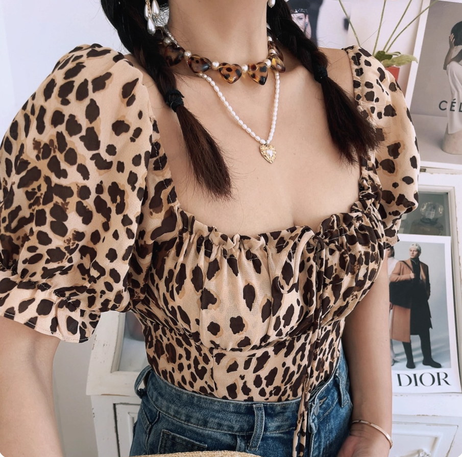 Sexy leopard print tie bow sexy two-wear puff sleeve shirt