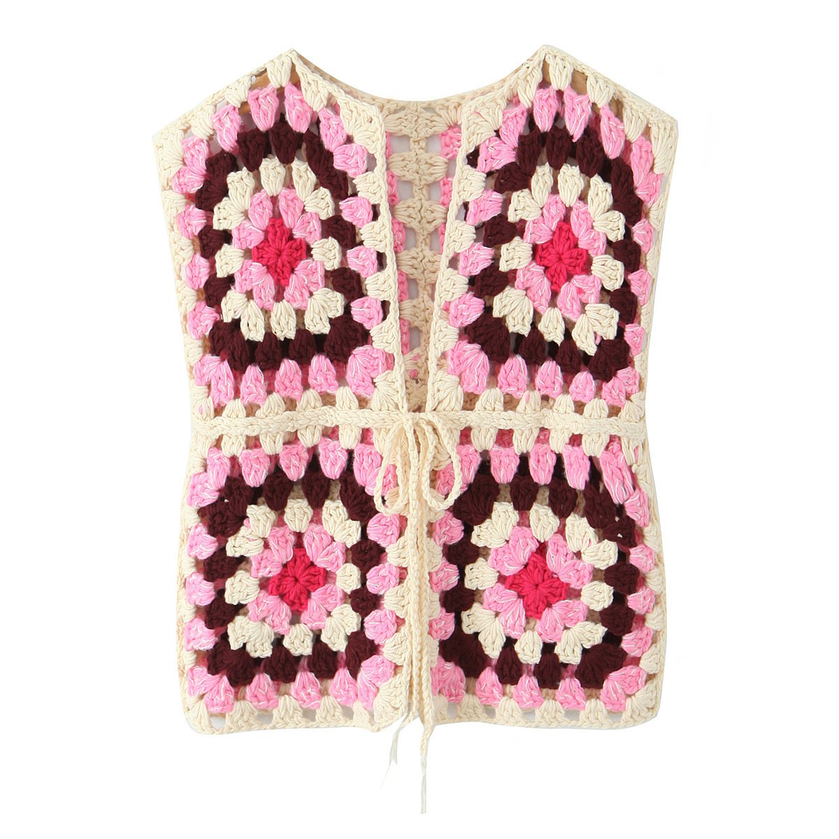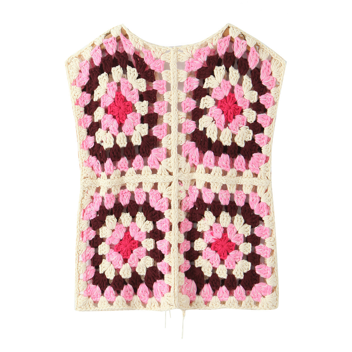 Retro literary romantic grandmother check design crocheted hollow lace knitted vest