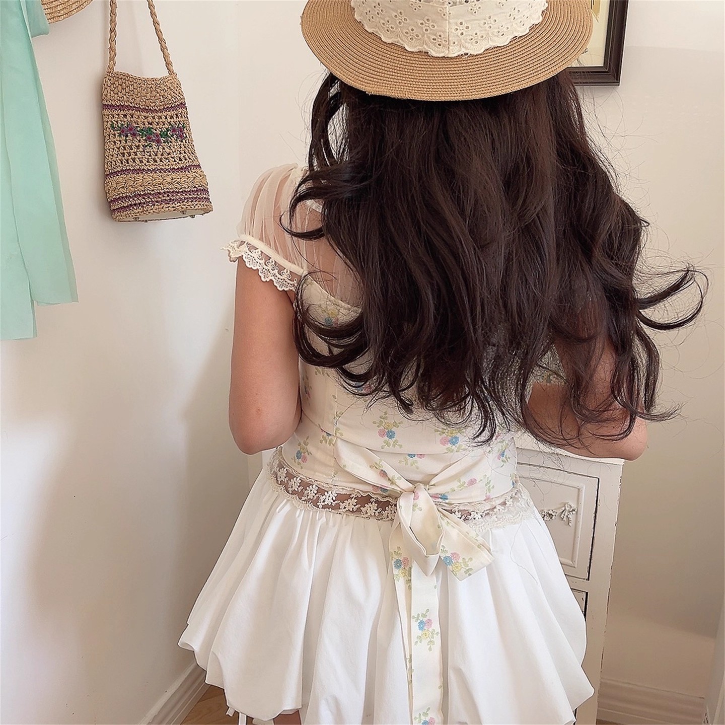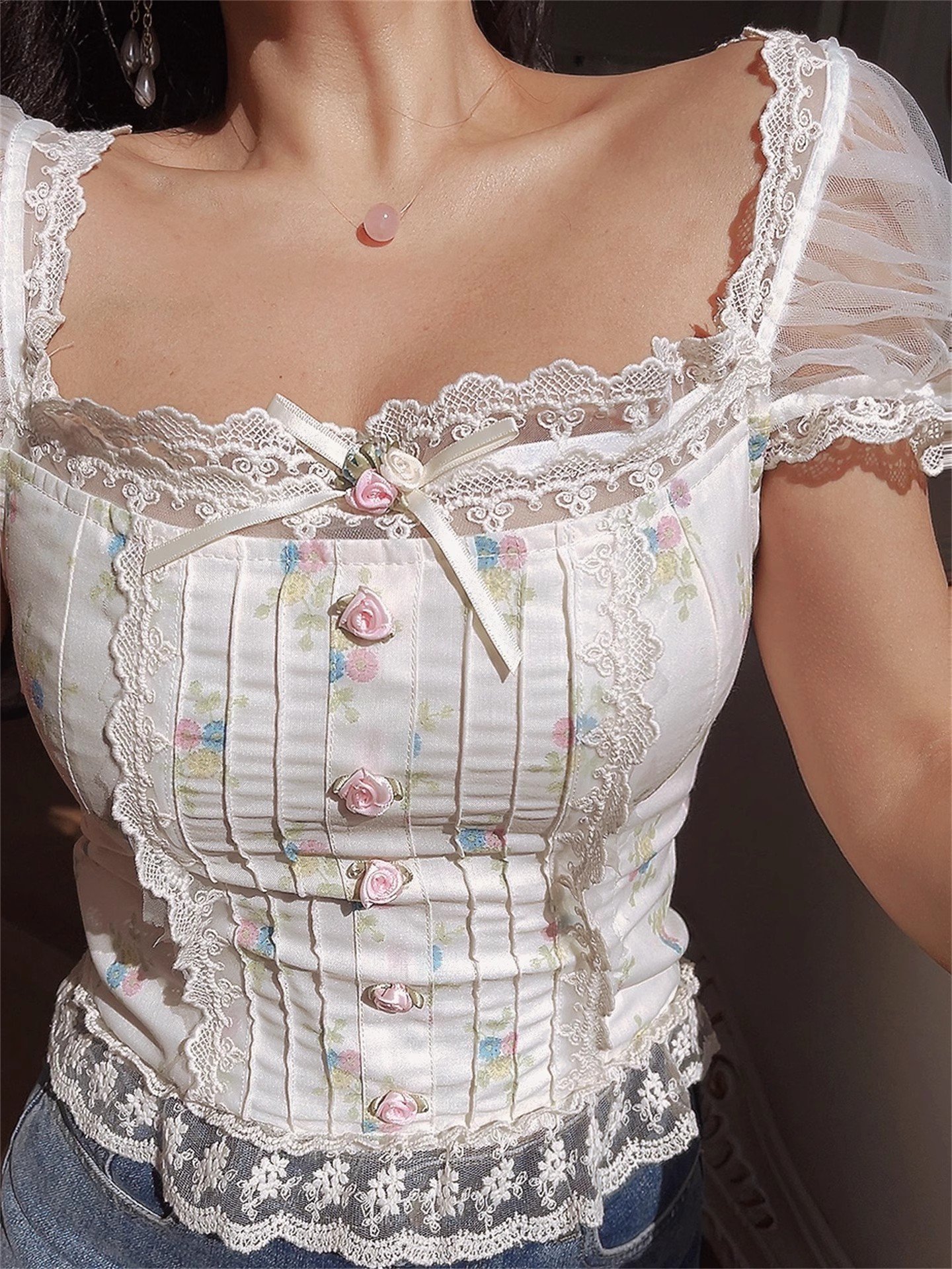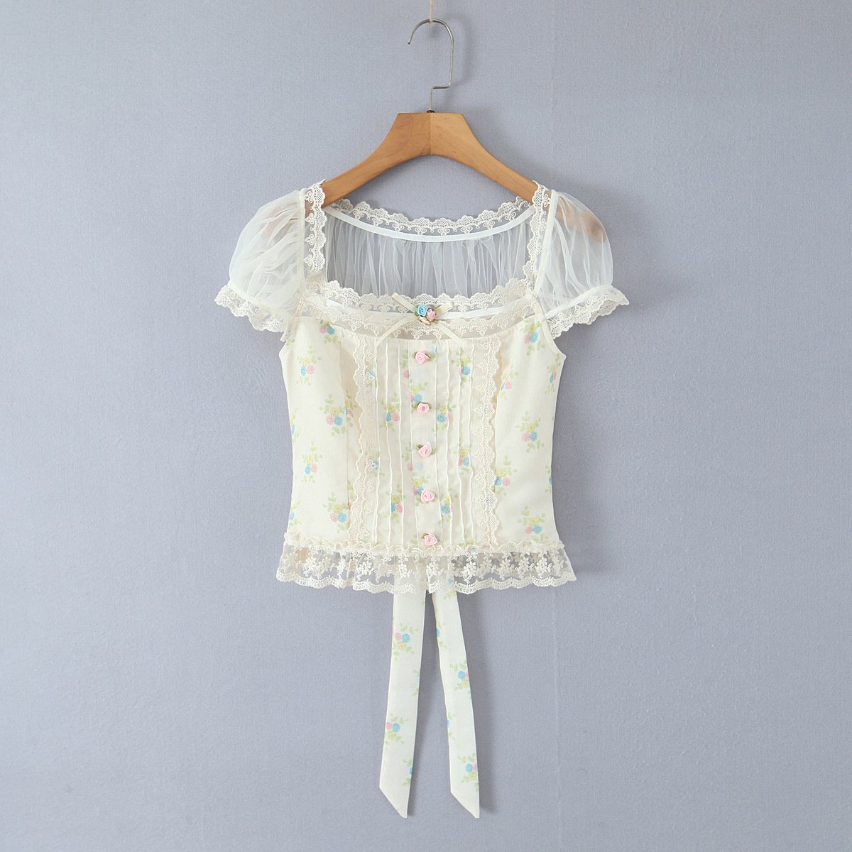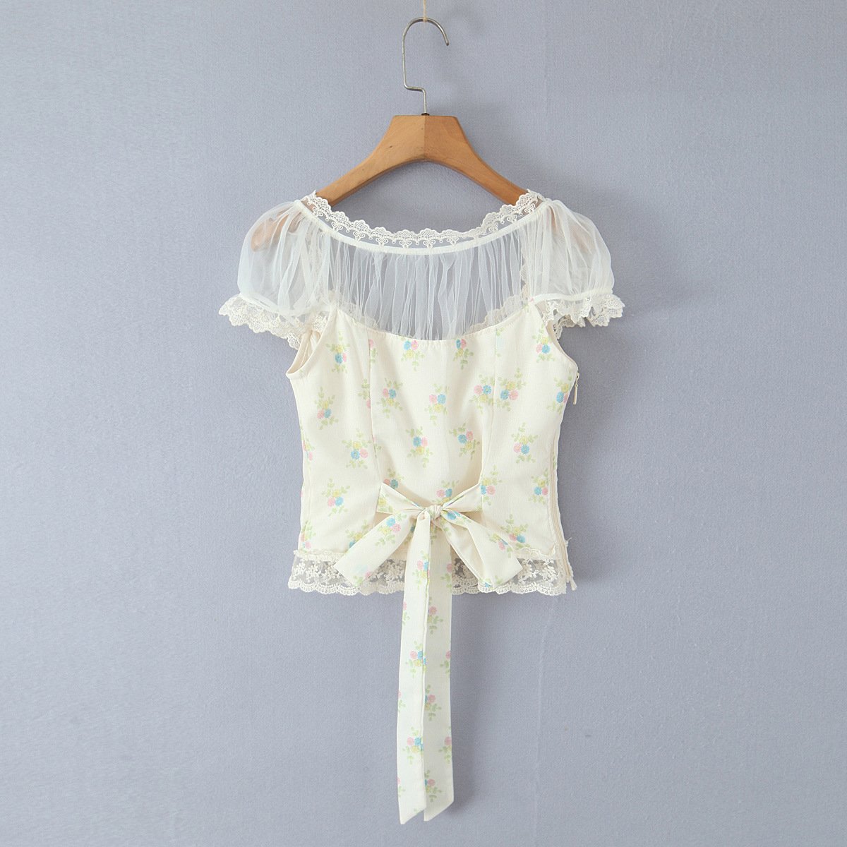 Sexy and sweet lace and mesh patchwork floral print shirt with tie-up detail.