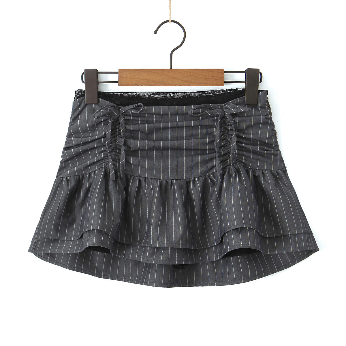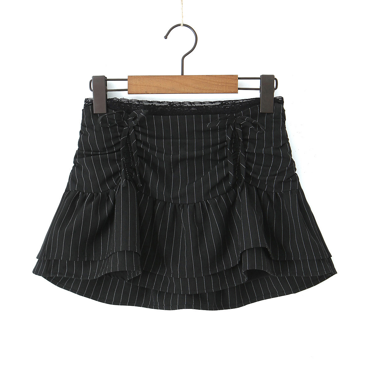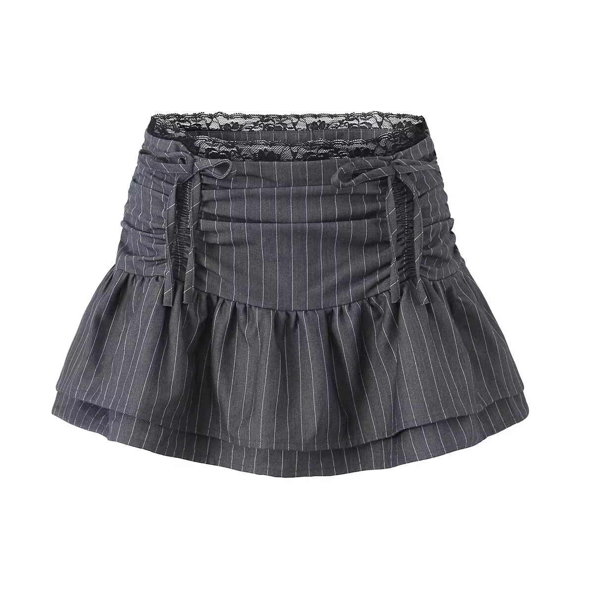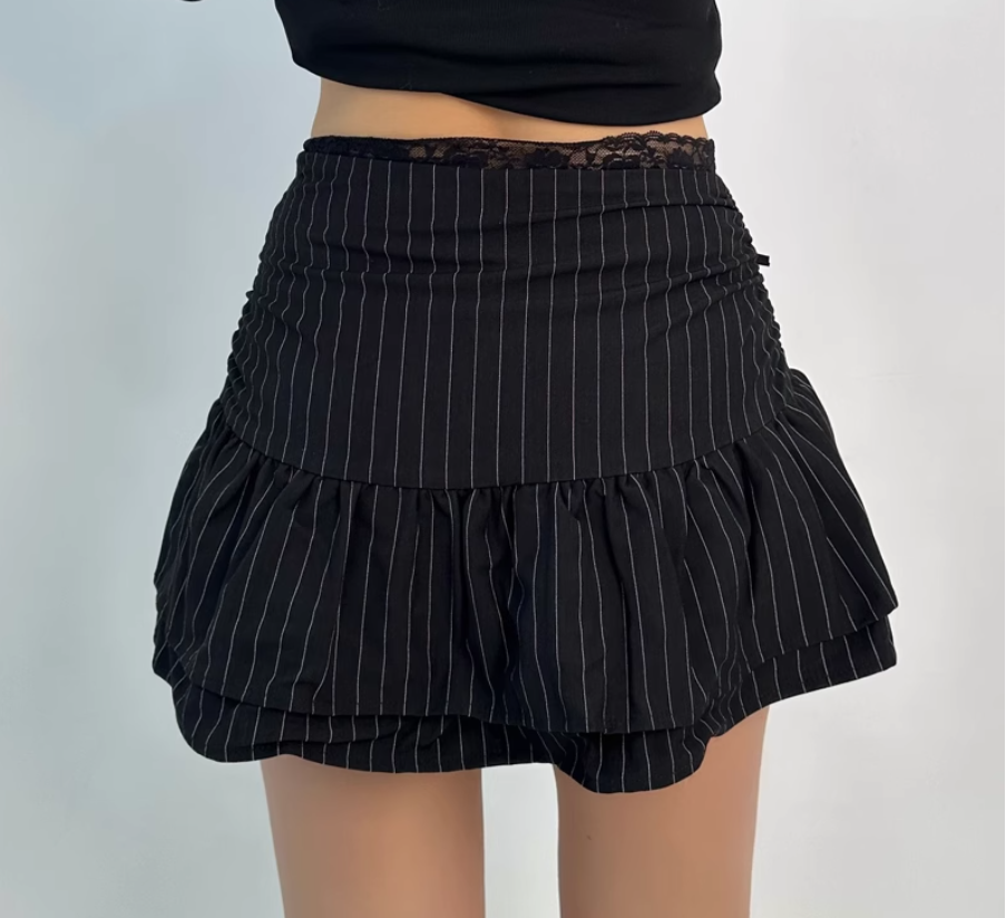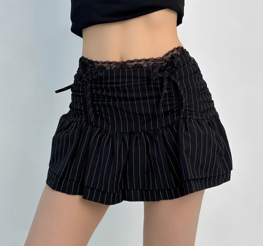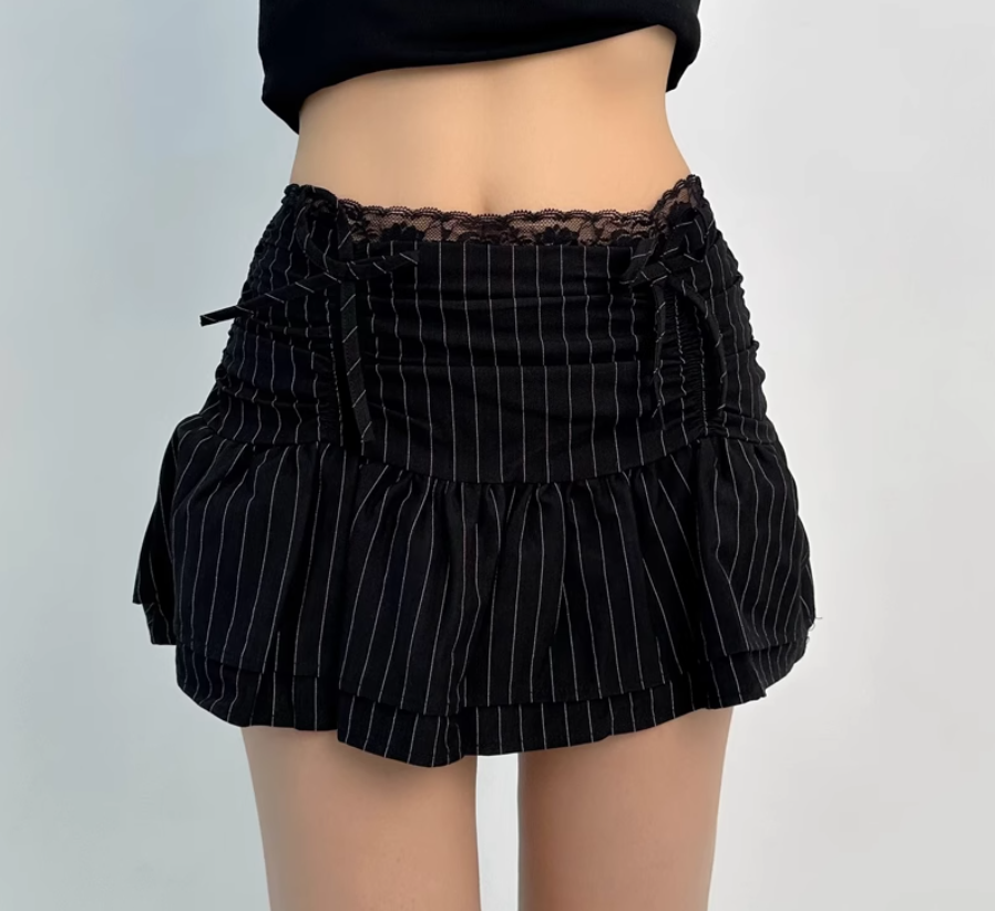 Lace patchwork puffy cloud skirt low waist drawstring anti-exposure striped short skirt